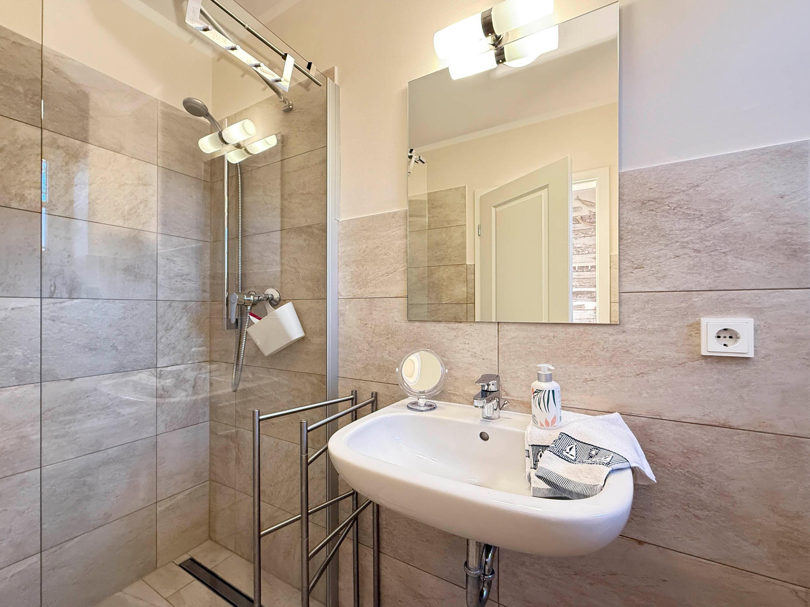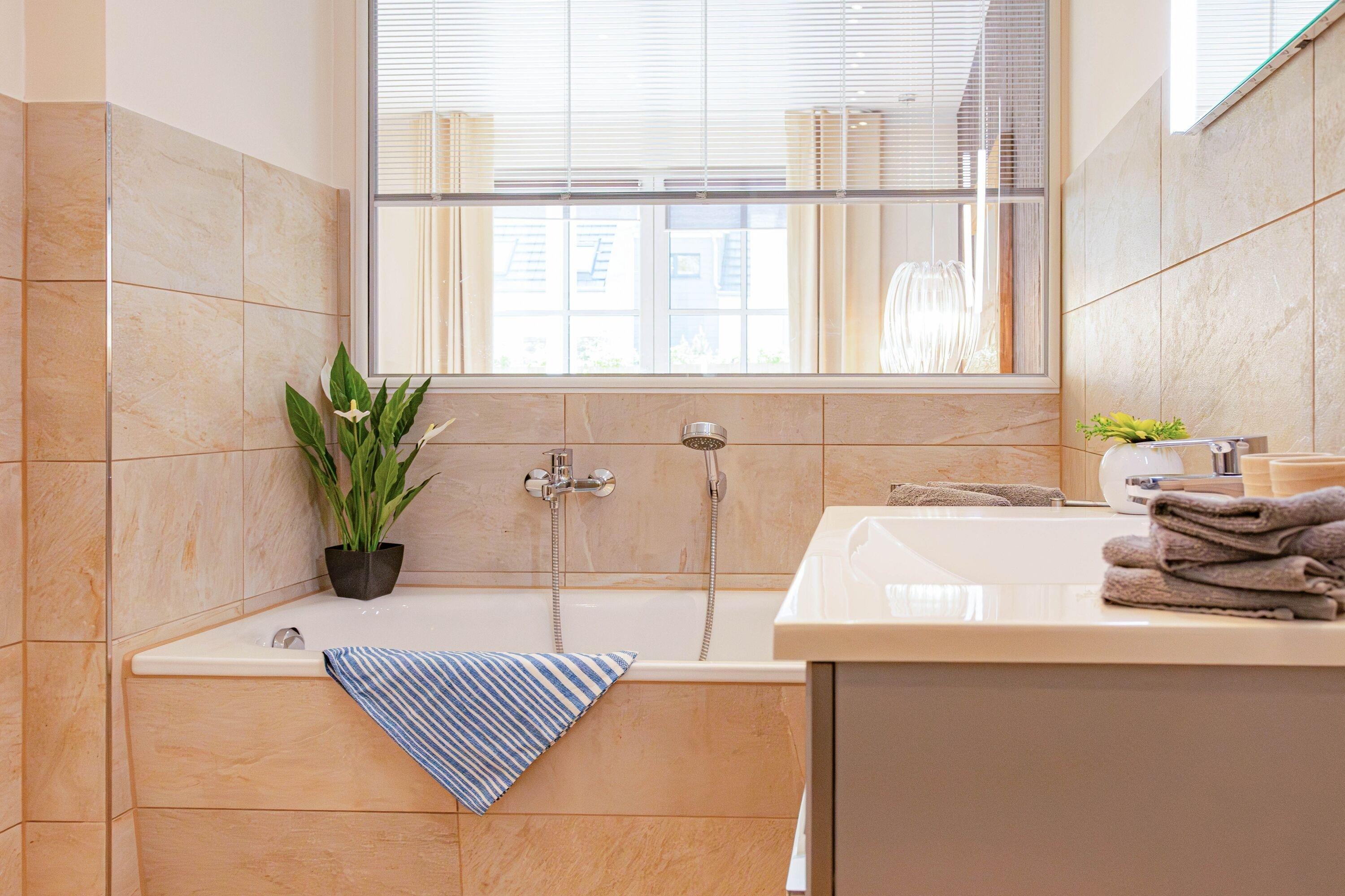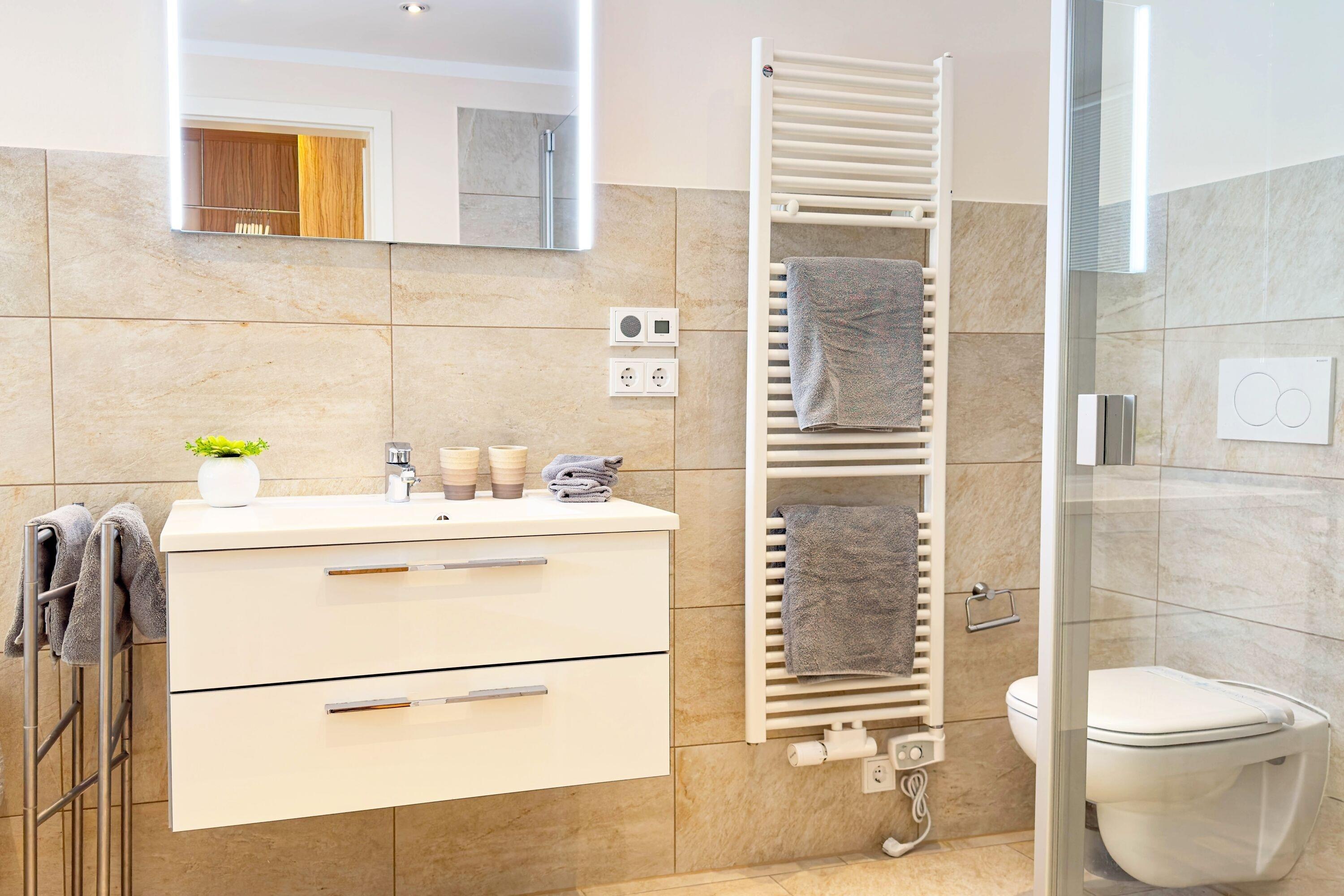 Badezimmer: Zwei moderne Bäder – eines mit Badewanne und Dusche, eines mit Dusche und WC, beide mit Fußbodenheizung