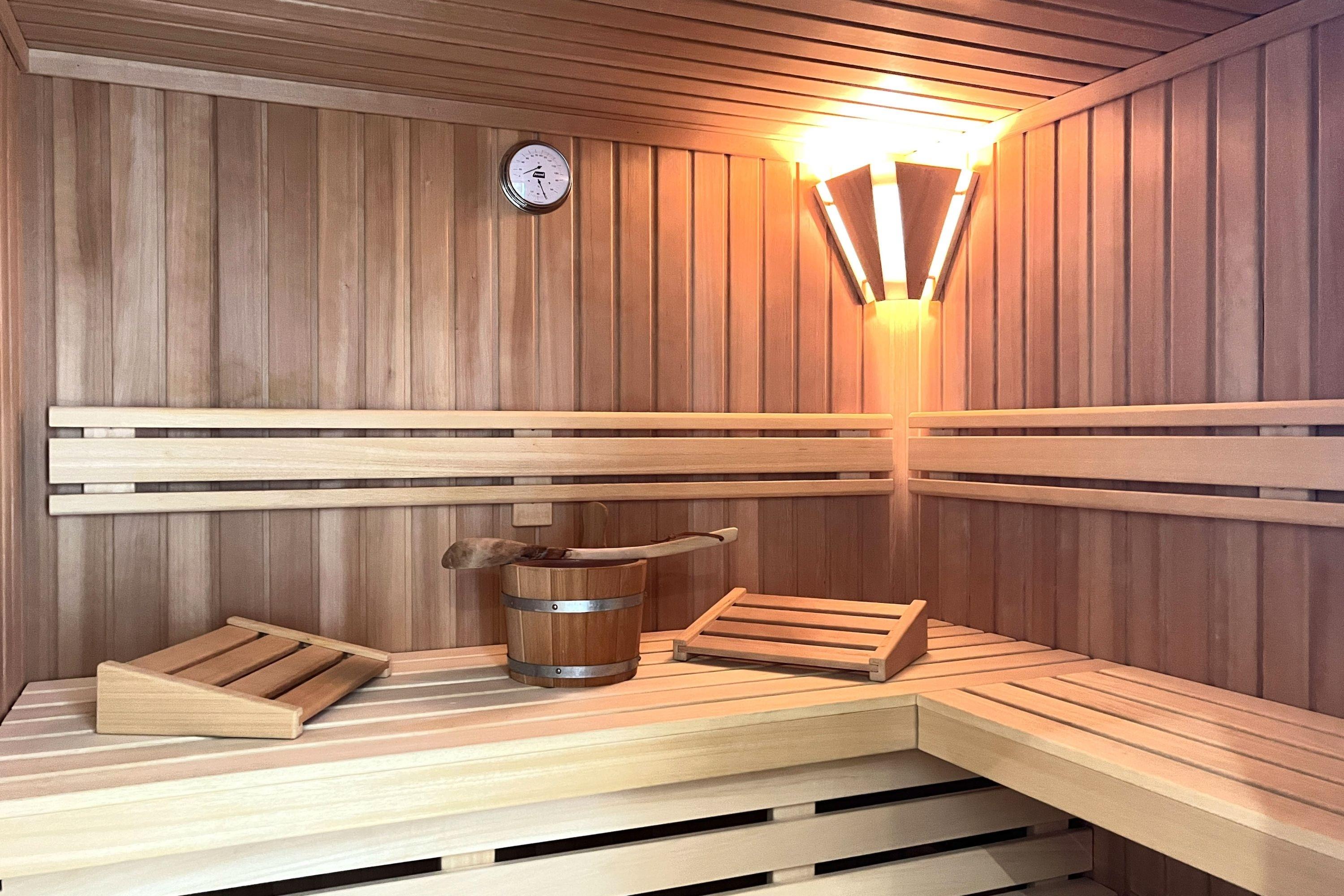 Im Obergeschoss befindet sich ein Badezimmer mit ebenerdiger Dusche, WC, Fußbodenheizung und einer kostenfreien Sauna. Ein weiteres Bad mit Dusche und WC liegt im Erdgeschoss. Der Hauswirtschaftsraum bietet eine Waschmaschine mit Trockner zur kostenfreien Nutzung.