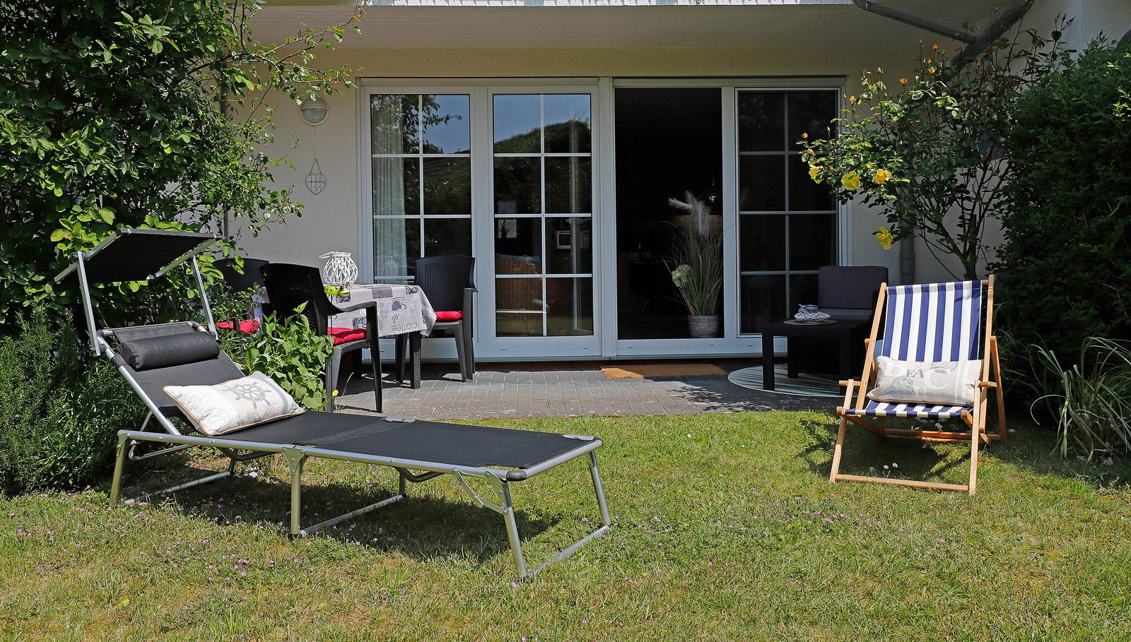 Angrenzender Garten mit Sonnenliegen für entspannte Stunden