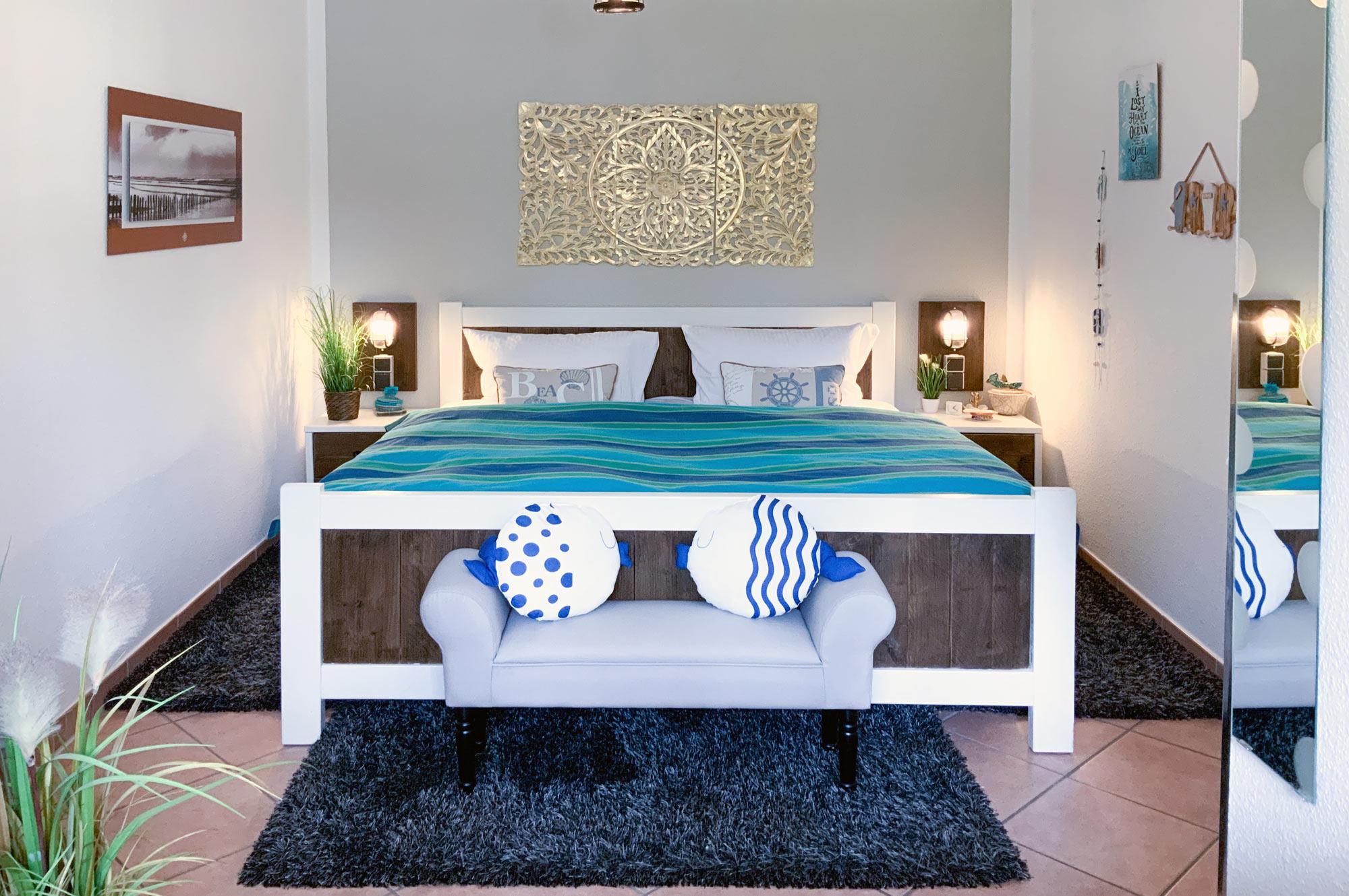 Gemütliches Schlafzimmer mit großem Doppelbett und Fliegengitter