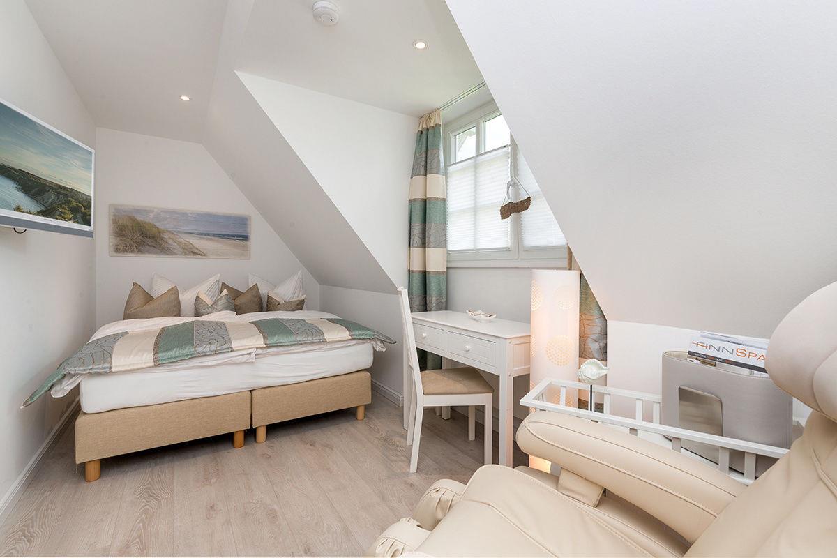 Im Obergeschoss erwarten Sie zwei traumhafte Schlafzimmer mit Boxspringbetten und eigenem Flachbild-TV, ergänzt durch ein stilvolles Badezimmer mit Sauna und Regendusche. Hier können Sie die Seele baumeln lassen und neue Energie tanken. Das Dachgeschoss bietet ein weiteres charmantes Schlafzimmer – ein behaglicher Rückzugsort, ideal für Kinder oder Freunde.