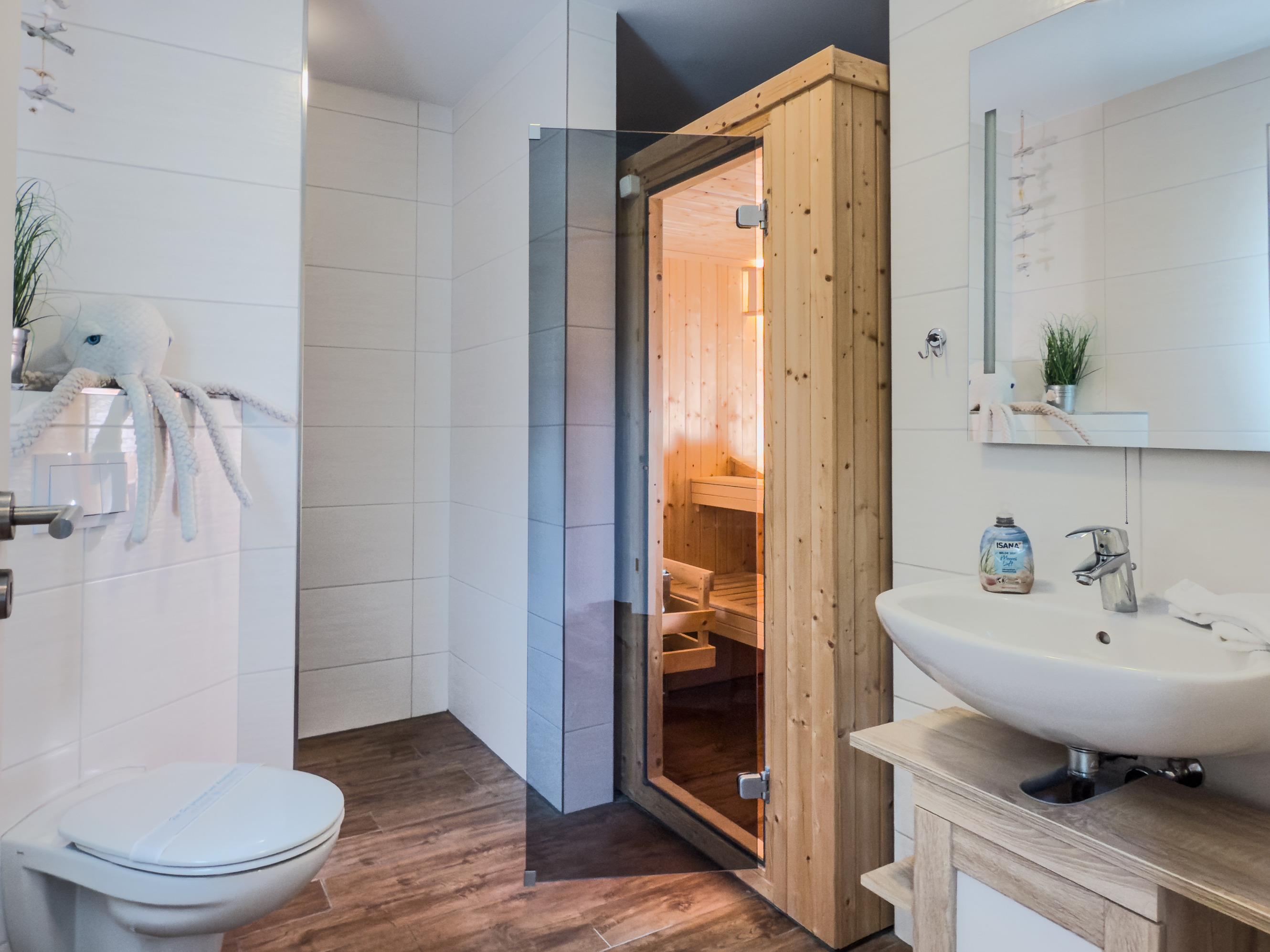 Zwei Badezimmer: eines mit Dusche und Sauna, das andere mit Badewanne und Dusche