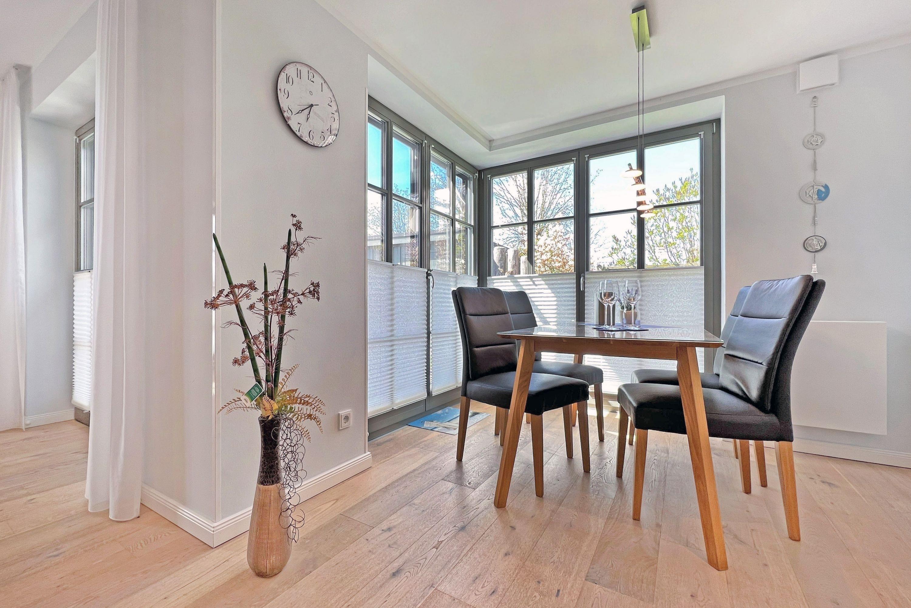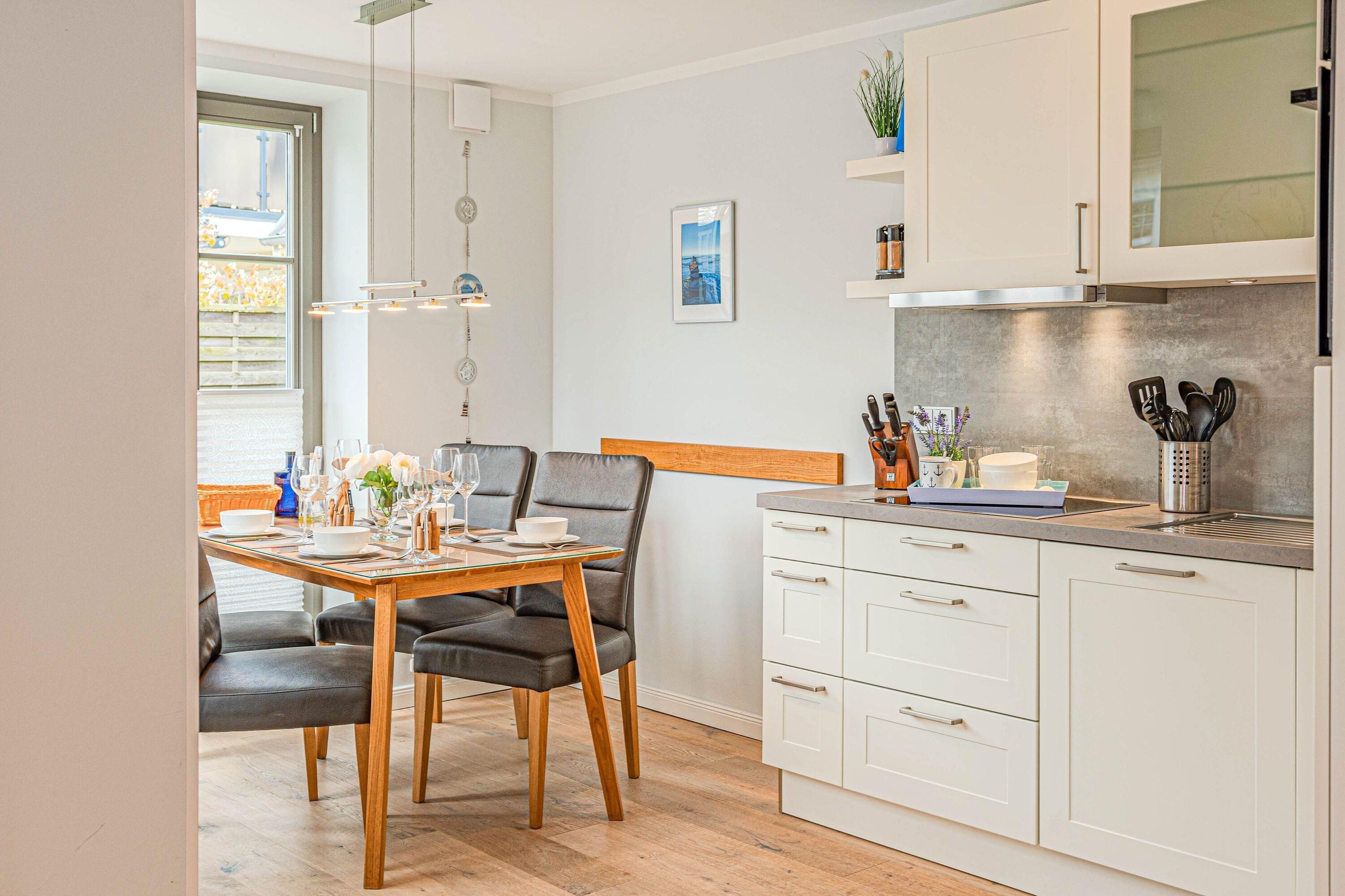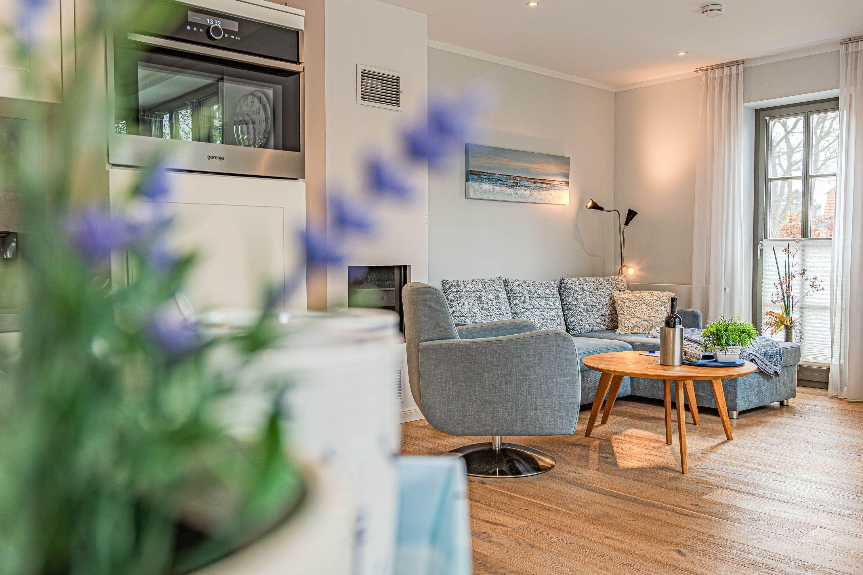 Die Ferienwohnung Wellenflüstern besticht durch ihre hochwertige Ausstattung und das stilvolle Ambiente. Der offene Wohn- und Essbereich mit Gaskamin lädt zu gemütlichen Stunden ein, während die voll ausgestattete Küche keine Wünsche offenlässt. Die beiden Schlafzimmer bieten erholsamen Schlafkomfort, und das moderne Badezimmer sorgt für einen angenehmen Start in den Tag.
