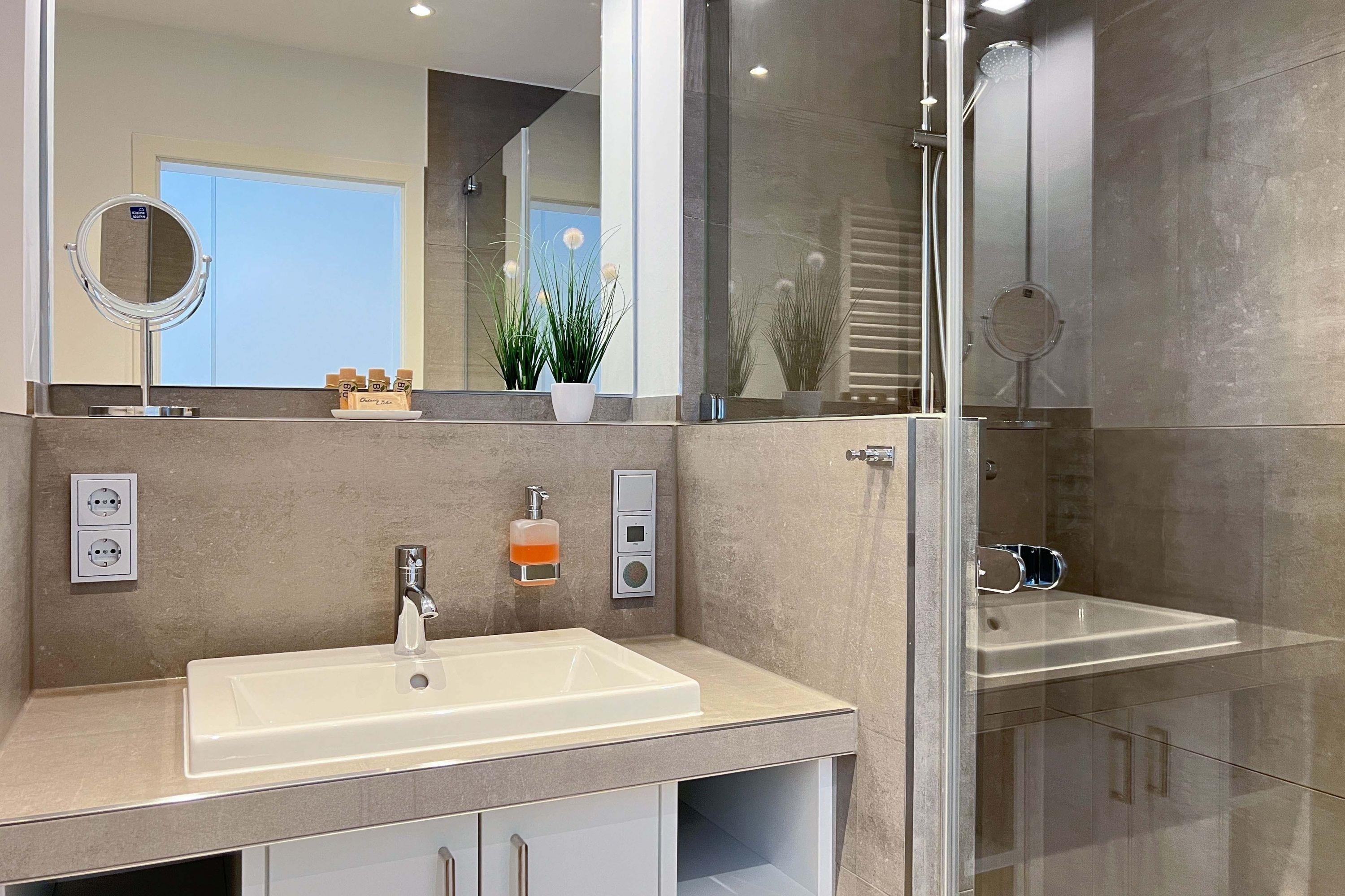 Modernes Badezimmer mit ebenerdiger Dusche und hochwertigen Armaturen