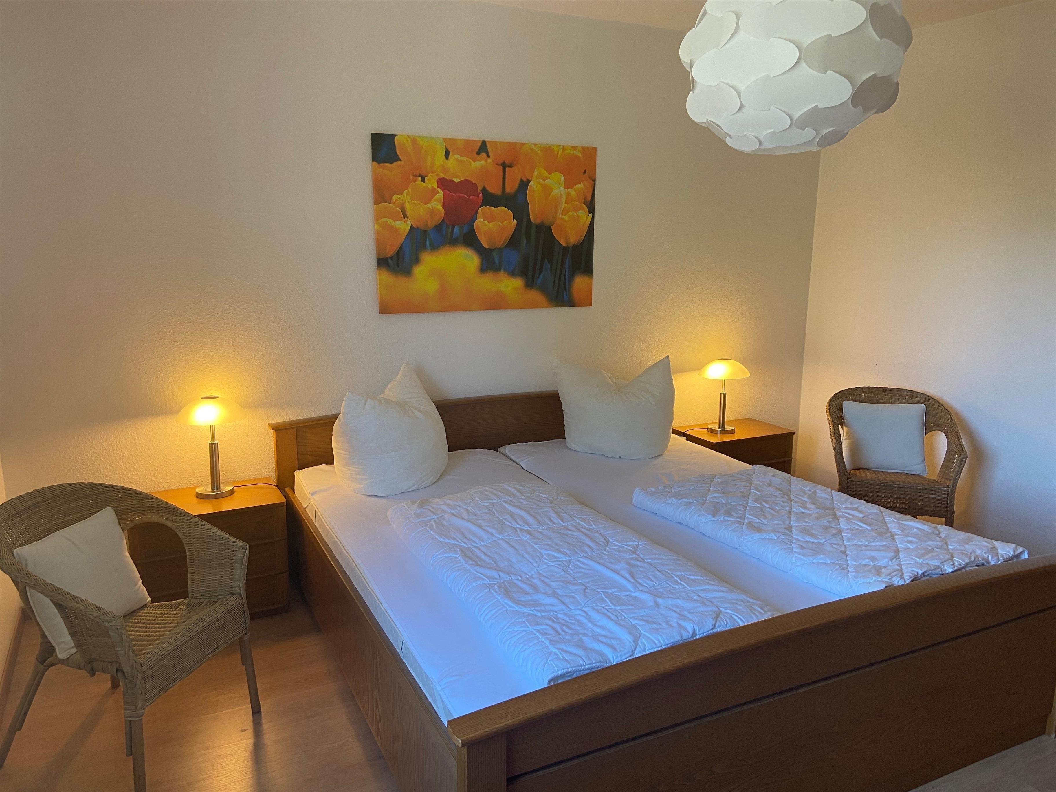 Schlafzimmer mit Doppelbett, Badezimmer mit Dusche und WC.