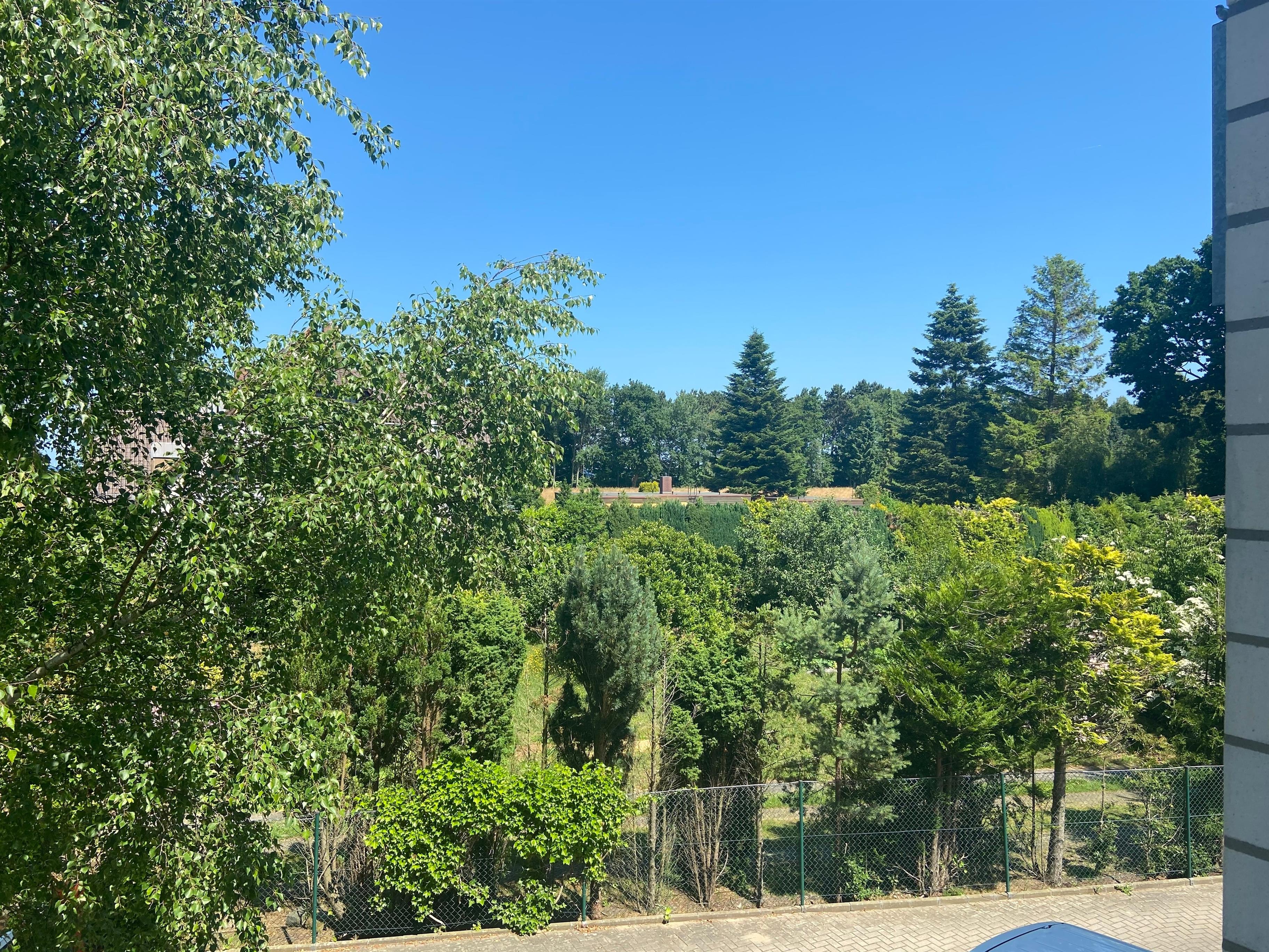 Wohnbereich mit offener Küche, schöner Balkon mit Blick auf die Birkenstraße.