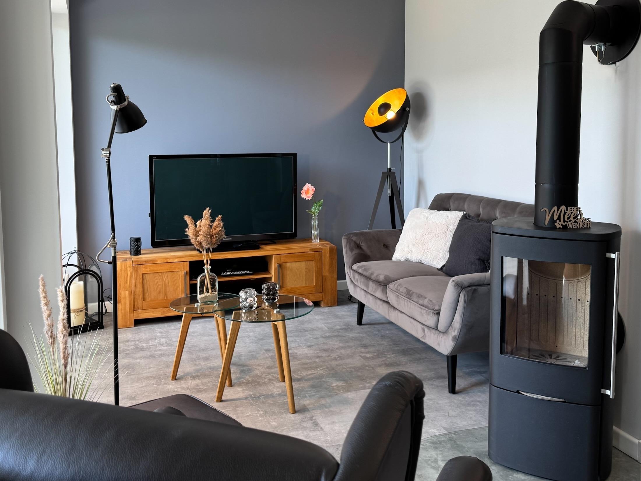 Willkommen in der modernen Ferienwohnung "Koje Lütt Kirr" in Zingst-Müggenburg! Der helle Wohn- und Essbereich mit bodentiefen Fenstern, Chesterfieldsofa, Smart-TV und Kamin lädt zum Entspannen ein. Highlight ist die Südterrasse mit Blick ins Grüne – Kraniche und Wildgänse fliegen direkt über Ihre Terrasse zur Vogelinsel Kirr!