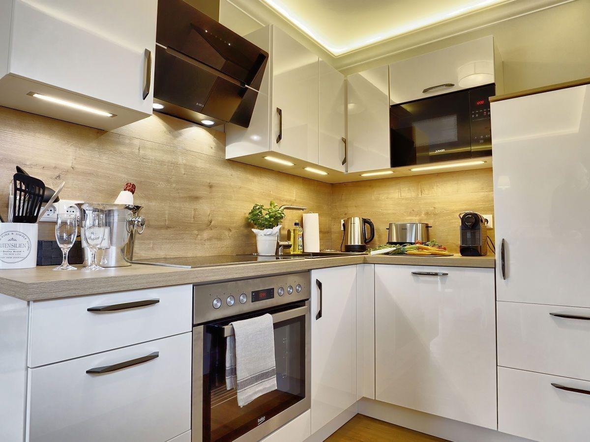 Die offene , angrenzende Einbauküche ist voll ausgestattet mit allen technischen Geräten .