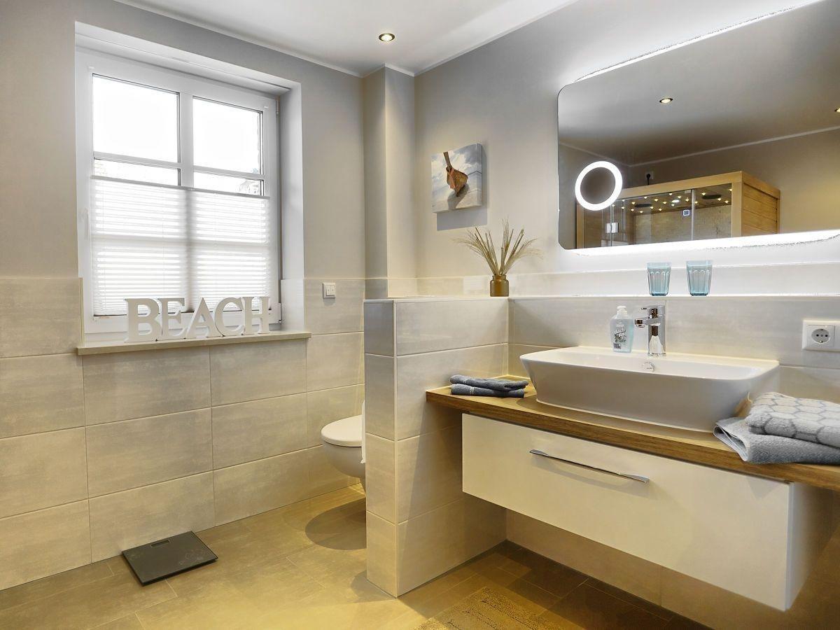 Das hochwertige Badezimmer , mit einer Infrarotkabine , verfügt über eine ebenerdige Dusche mit Regenshower und einer Handbrause, WC, edlem Waschtisch, beheizbaren Handtuchtrockner, Kosmetik-Vergrößerungsspiegel und einem Föhn.