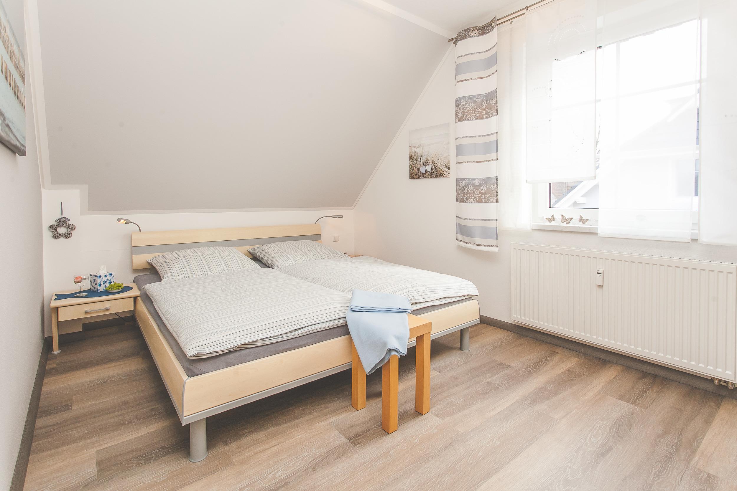 Sie ist ausgestattet mit 2 Schlafräumen ( 2x1 Doppelbett ), einem Wohnbereich mit einem Schlafsofa, einer komplett ausgestatteten Küchenzeile (Spülmaschine, Kühlschrank m. Gefrierfach, Cerankochfeld, Backofen, Mikrowelle, Kaffeemaschine, Toaster ... ) und einem Bad mit Dusche und WC. Zur weiteren Einrichtung gehören ein Flachbildfernseher, ein CD-Radio, ein Kinderhochstuhl und ein Babyreisebett mit sep. Matratze. Die helle Nichtraucherwohnung liegt im 1.OG und besitzt einen Balkon mit Gartenmöbeln, auf dem das Grillen nur mit einem Elektrogrill gestattet ist. Ein PKW-Stellplatz und ein Fahrradraum stehen Ihnen zur Verfügung. Die Entfernung zum Strand beträgt 300 Meter, zum Zentrum sind es ca. 10 Minuten Fußweg.