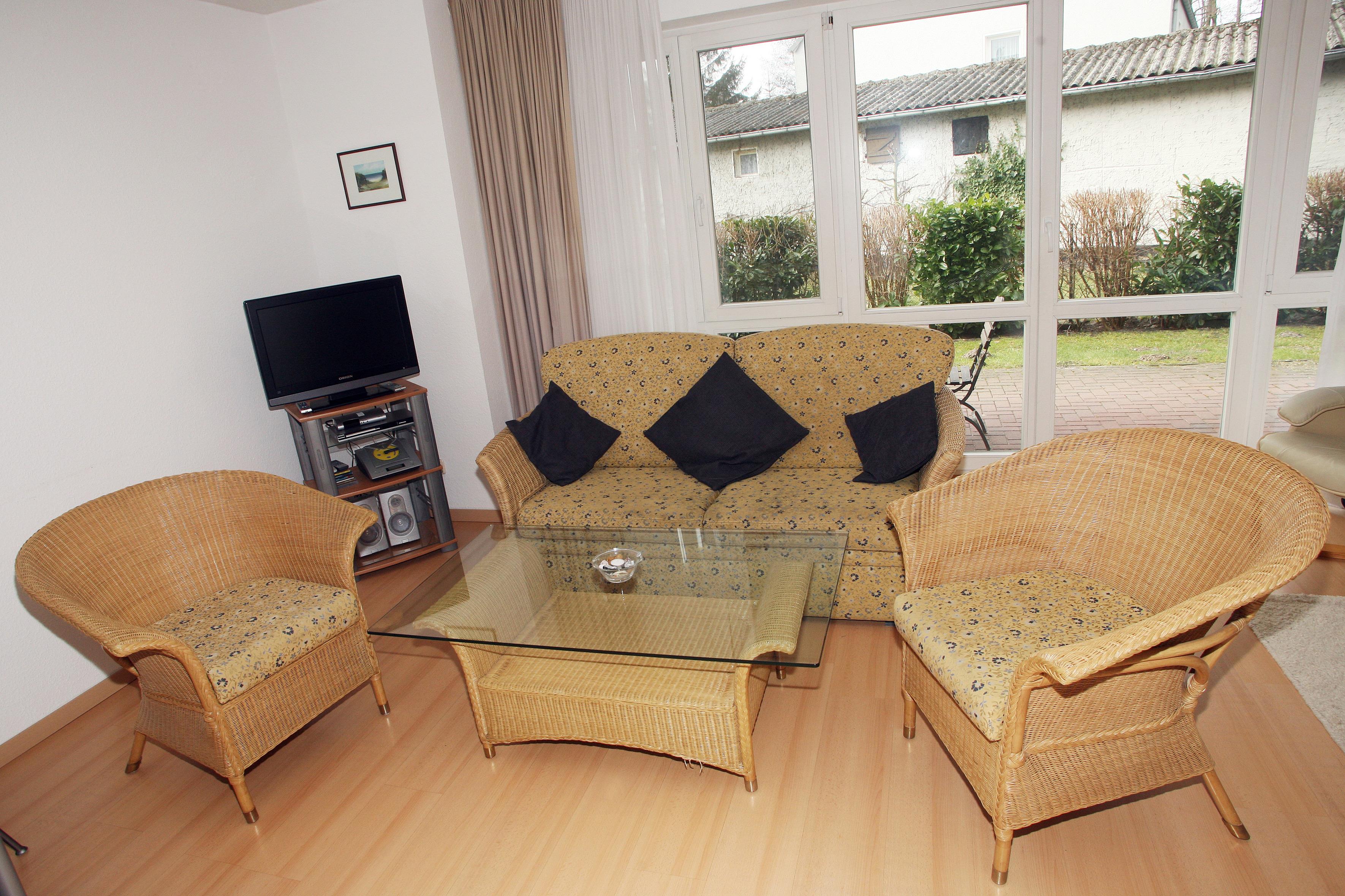 Das Apartment befindet sich im Erdgeschoss und besitzt eine Terrasse mit Gartenmöbeln.