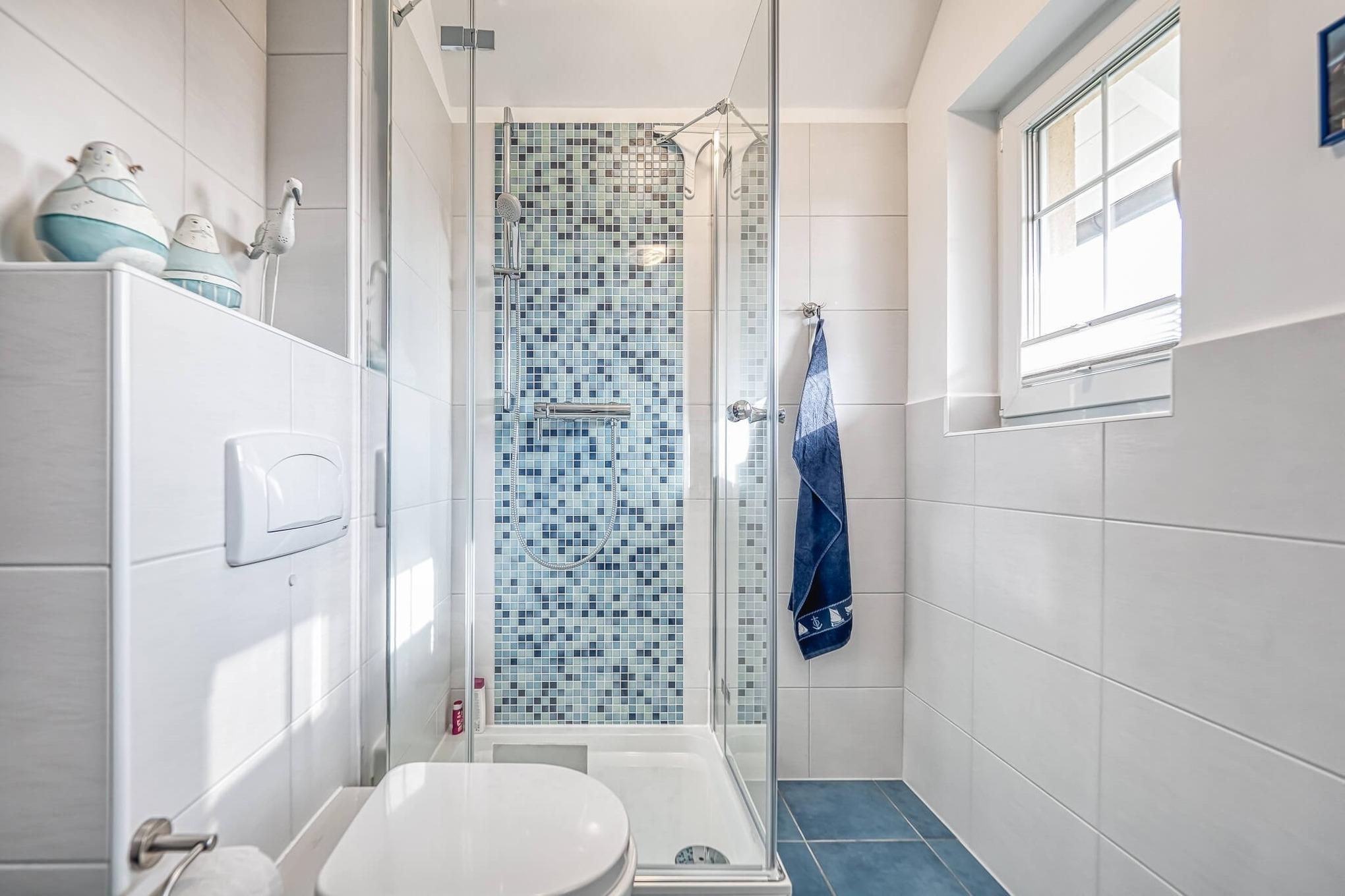 Im Obergeschoss befinden sich 2 Schlafräume und ein weiteres Bad (Dusche/WC).