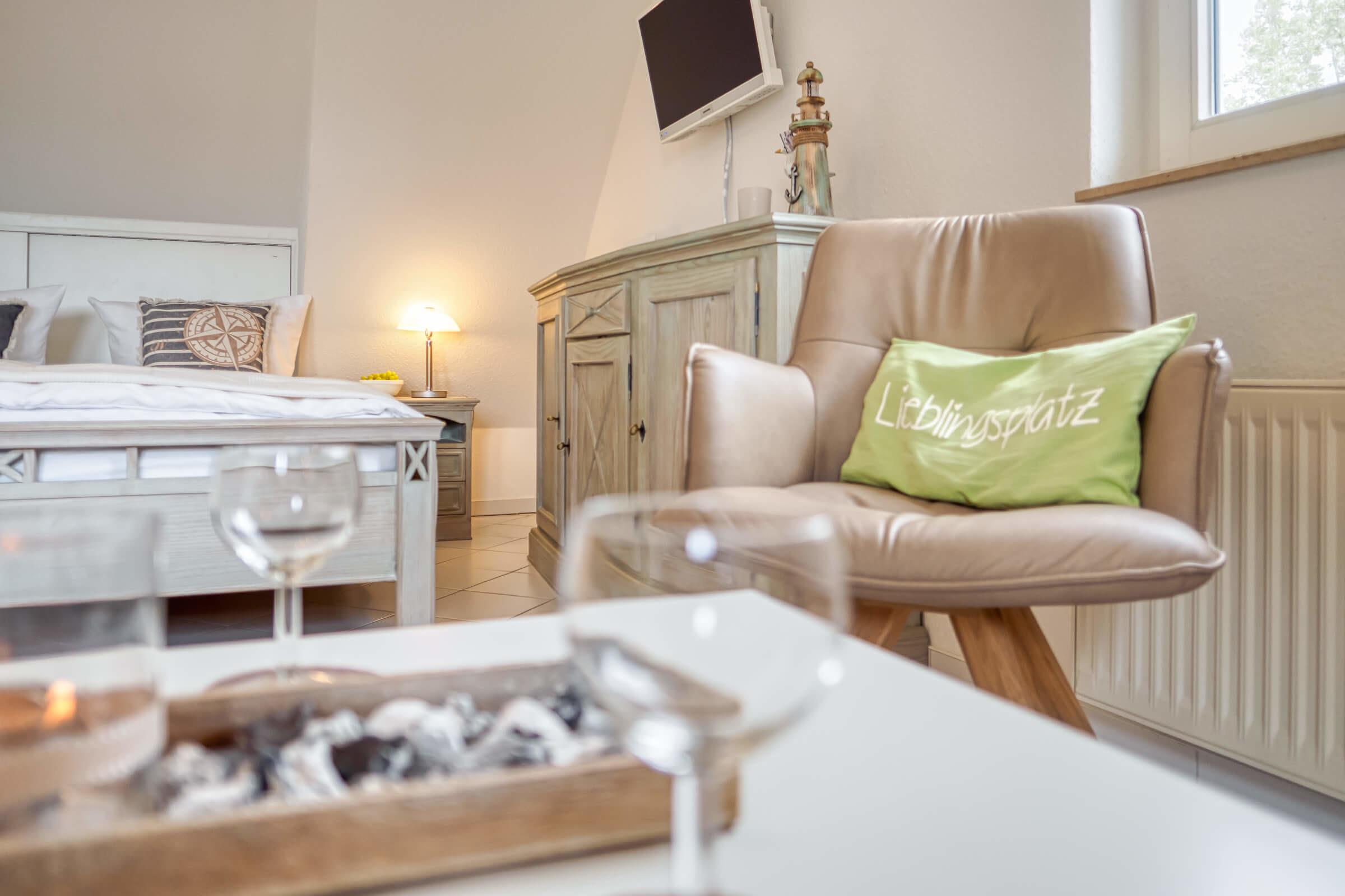 Es ist ausgestattet mit einem Doppelbett, einer Sitzgruppe, SAT-TV und Radio, einer separaten Küche, sowie einem Bad mit Dusche und WC.