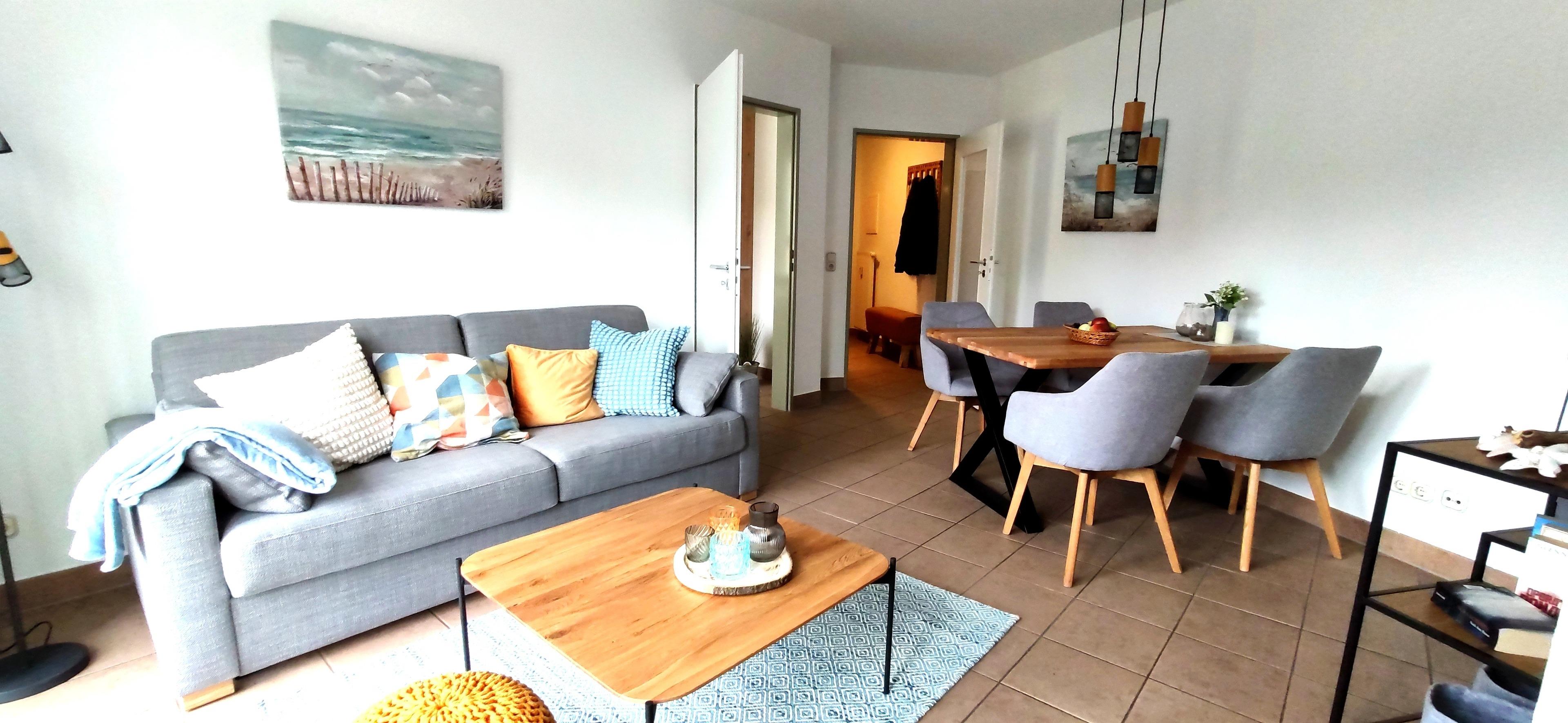 Die im Februar 2025 neu möblierte Ferienwohnung im 1. Stock hat Platz für 4 Personen (max. 3 Erwachsene). Der modern gemütlich eingerichtete Wohn-/ Essbereich mit dem großzügigen Esstisch bietet ausreichend Platz für Mahlzeiten und Spieleabende. Die bequeme Couch (inkl. Schlafvorrichtung mit durchgehender Liegefläche 170x200 cm) verspricht pures Wohlbefinden.