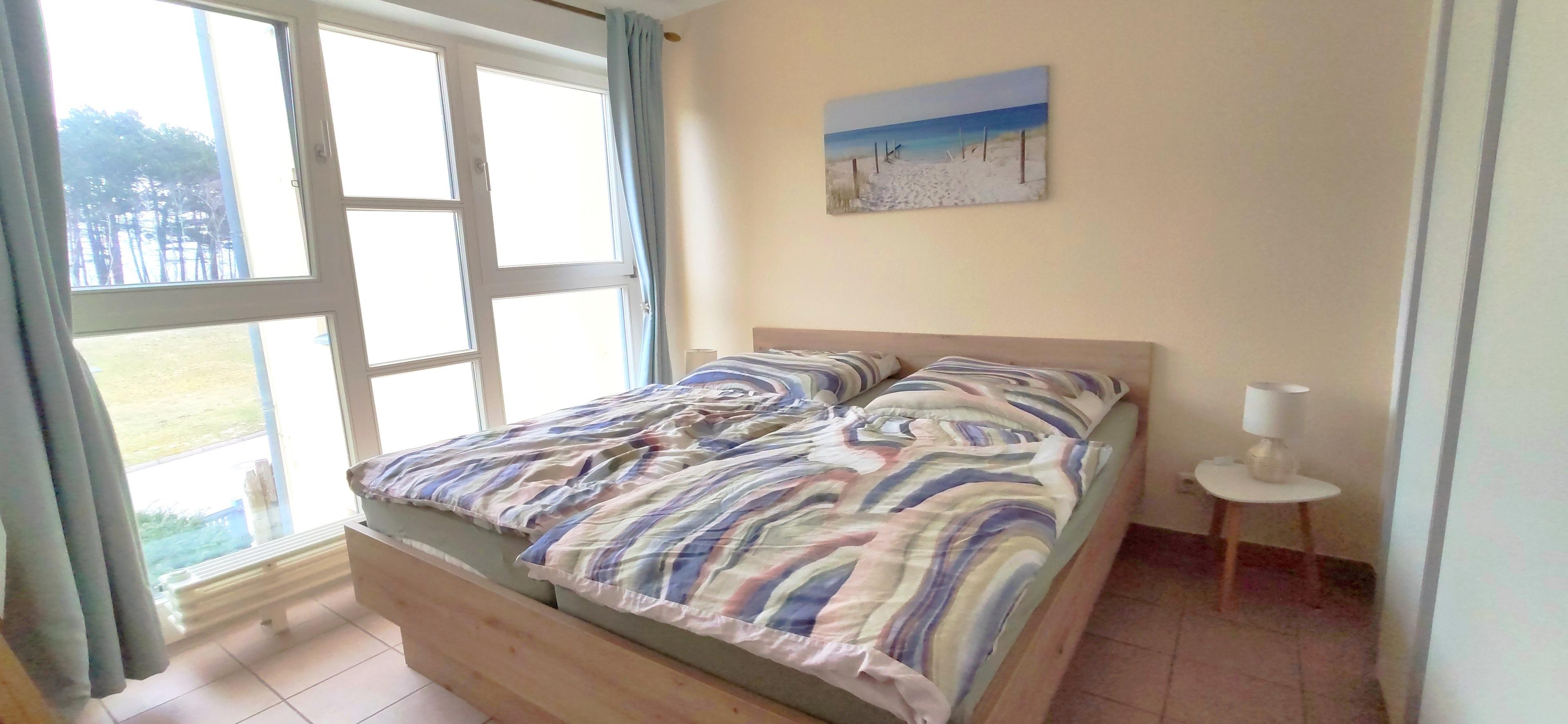 Das ebenfalls neu gestaltete Schlafzimmer mit dem komfortablem Doppelbett (180 x200 cm) und Fensterfront zur Ostseeseite lässt einen entspannt einschlafen. In dem Schwebetürenschrank findet die Urlaubskleidung viel Platz.