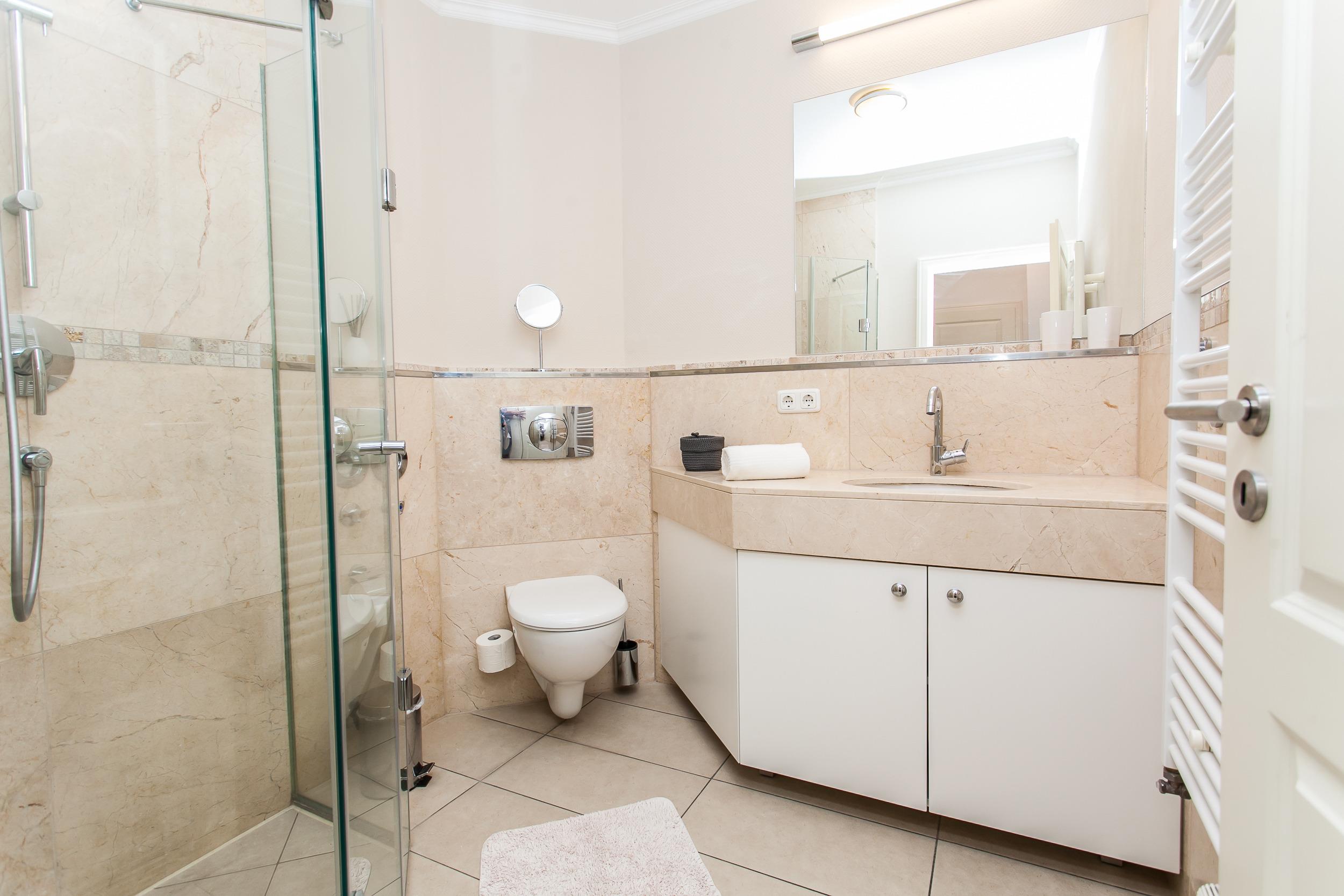Wohnbereich, DVD Player, Bose-Stereoanlage, ein Badezimmer in Marmor mit ebenerdiger Dusche sowie einer 20 m²-großen Terrasse ( Ost-Ausrichtung) mit Gartenmöbeln, eine voll ausgestattete Küchenzeile. Ihnen steht ein Tiefgaragenstellplatz (Nr. 1) sowie Waschküche und Fahrradkeller zur Verfügung. WLAN kostenfrei vorhanden. In der Nichtraucherwohnung sind Haustiere nicht gestattet.