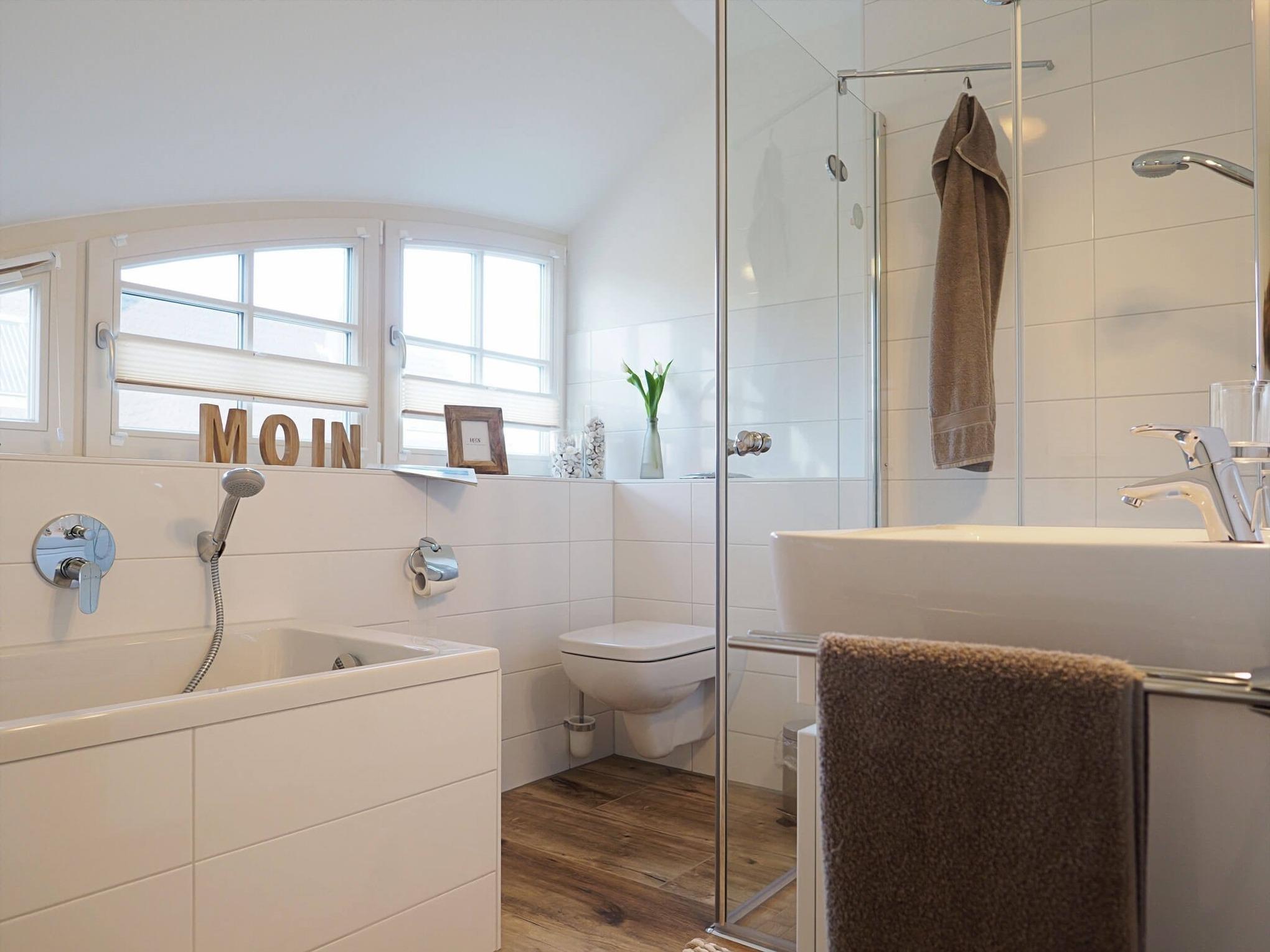 Im Obergeschoss verfügt das Ferienhaus über ein Bad mit Badewanne, Dusche, WC, Handtuchtrockner und Fön sowie drei Schlafzimmer: eines mit Doppelbett (180x200 cm) und TV, ein weiteres mit Boxspringbett (160x200 cm) und TV sowie das dritte mit Boxspringbett (160 x 200 cm) ohne TV.