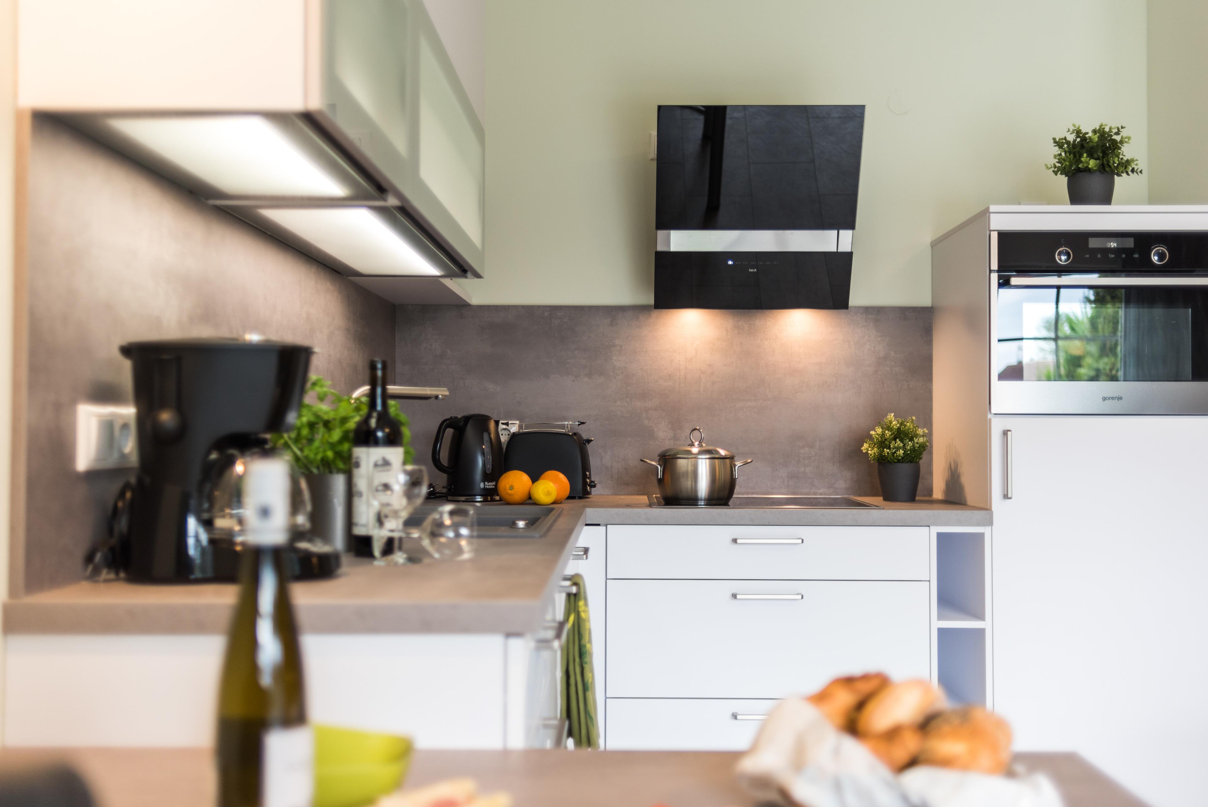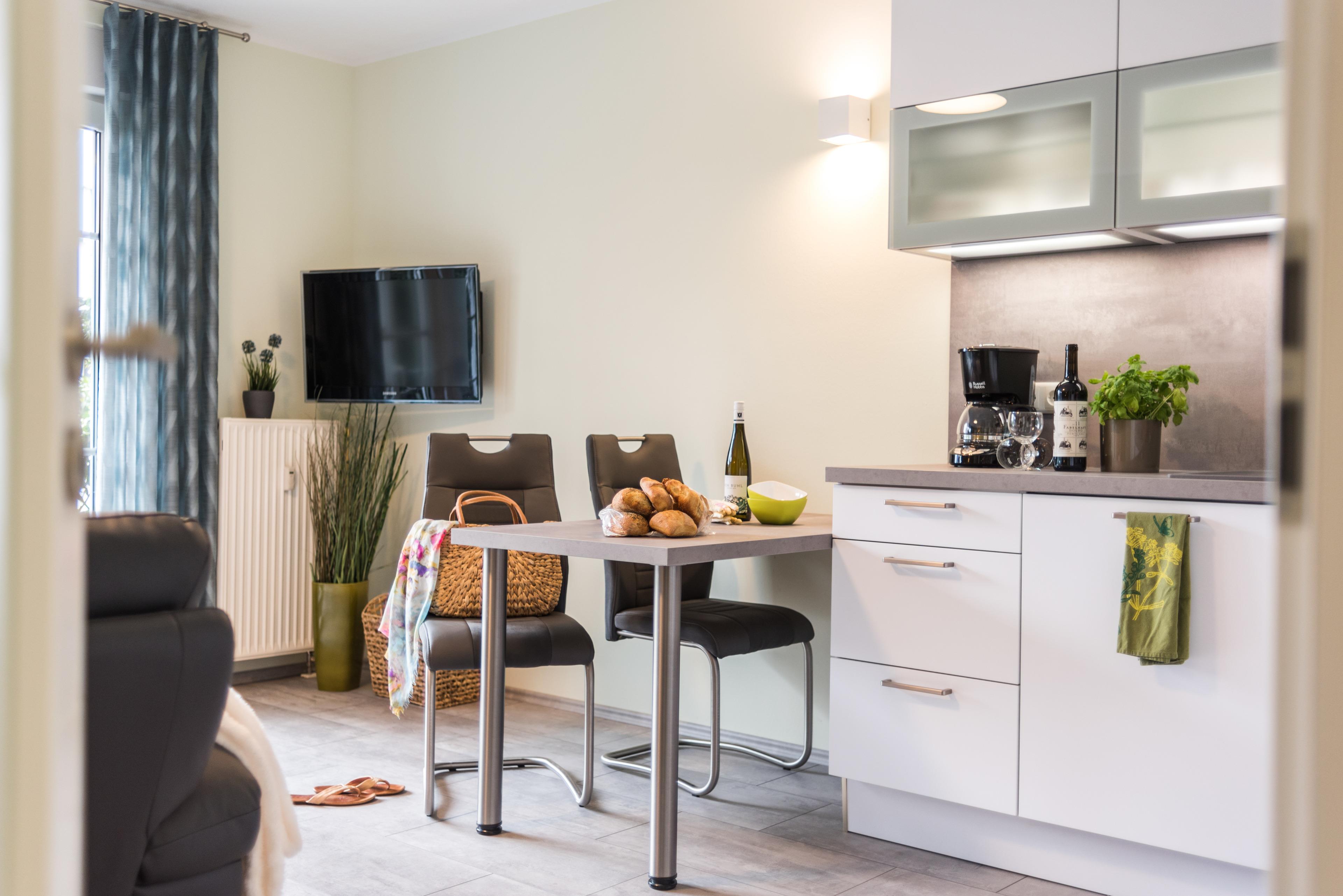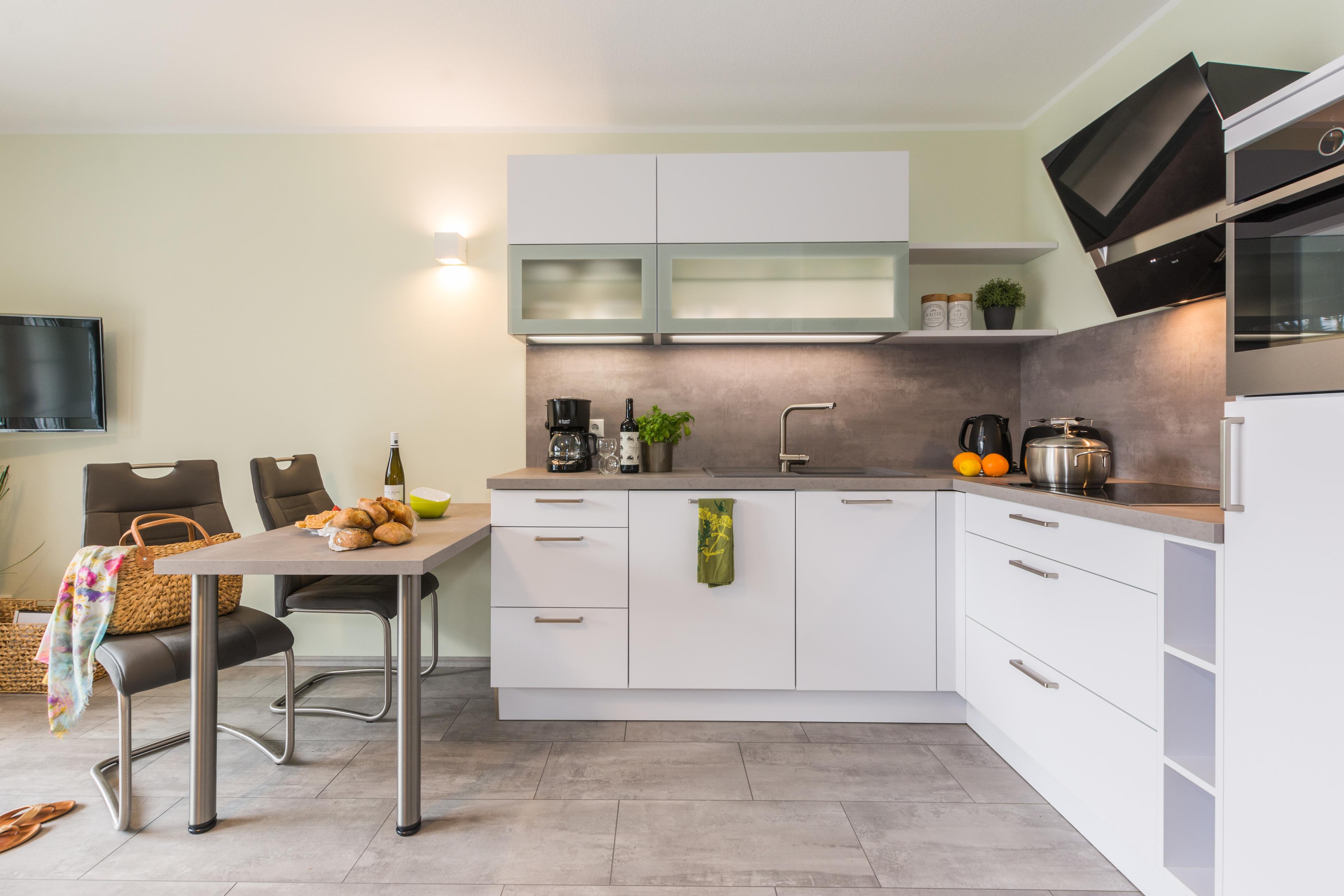 Flat Screen TV im Wohnzimmer, Bücher, voll eingerichtete Küchenzeile mit Geschirrspülmaschine, Kühlschrank, Cerankochfeld, Backofen, Kaffeemaschine, Wasserkocher, Toaster.