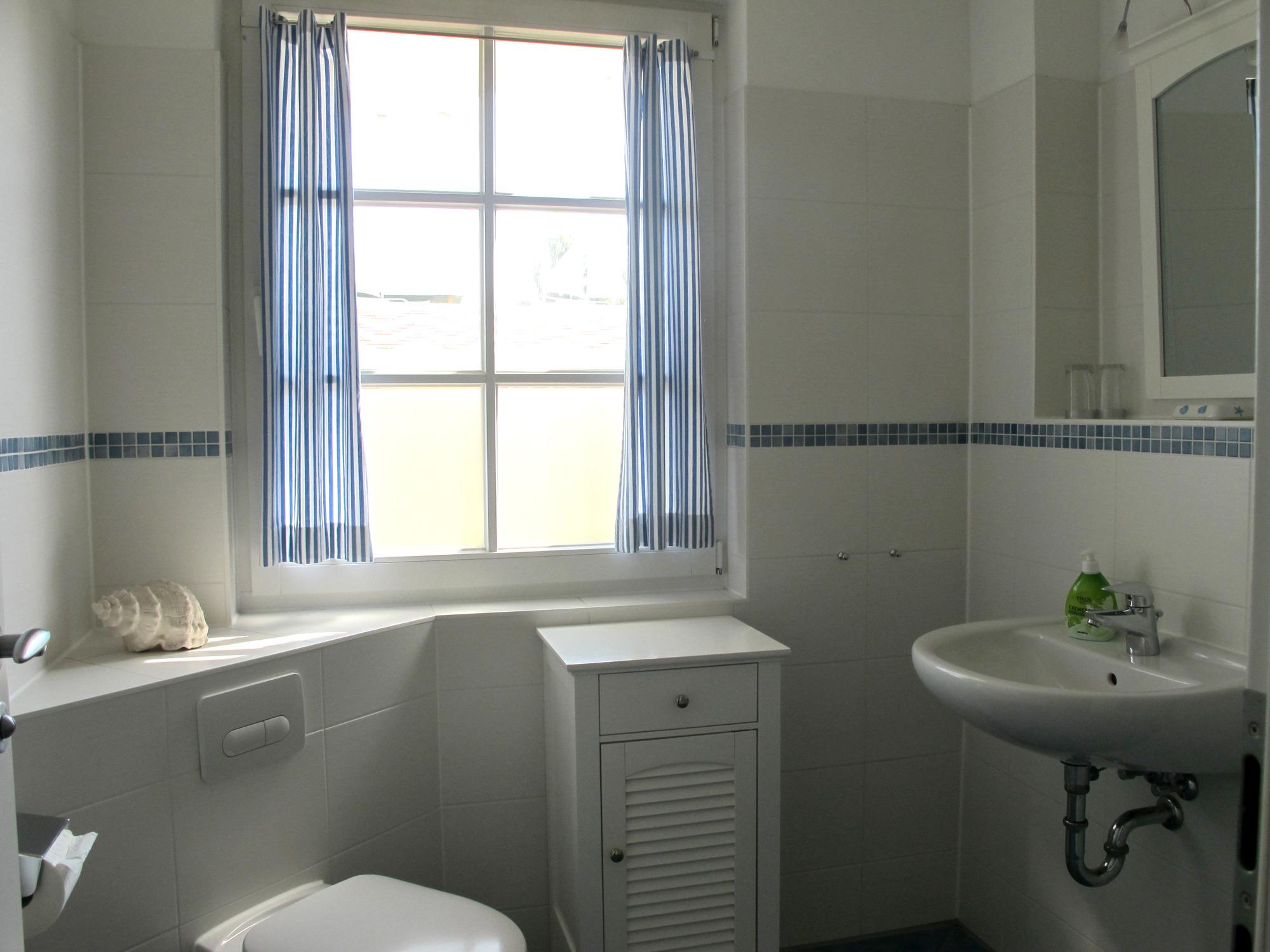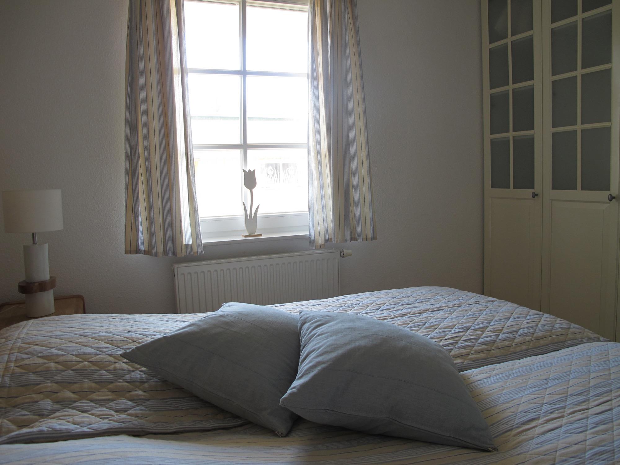 Das Schlafzimmer hat ein Doppelbett 180 x 200 cm. Das Bad bietet ein großes Fenster mit Tageslicht.