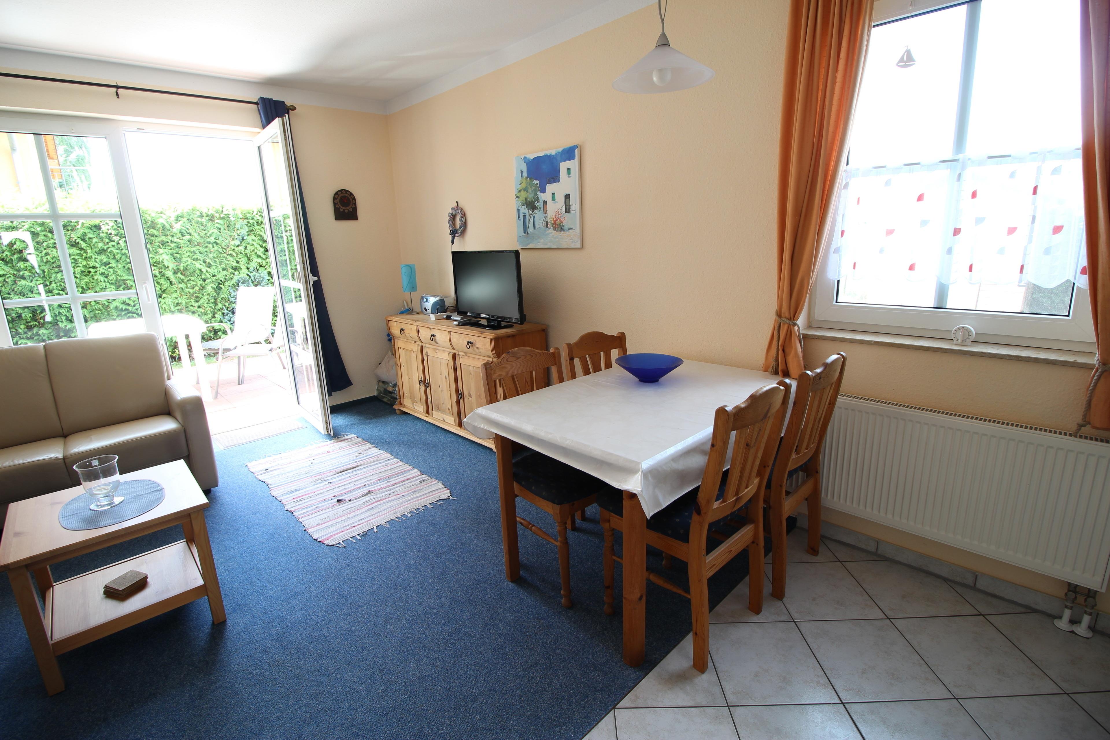Die 3-Raum-Ferienwohnung bietet auf ca.55qm ausreichend Platz für 4 Personen + Kleinkind.In dem gemütlich eingerichtetem Wohnzimmer stehen Ihnen ein TV zur Verfügung. Von hier haben Sie einen direkten Zugang zur sonnigen Süd-Terrasse mit bequemen Gartenmöbeln, wo Sie einen schönen Strandtag ausklingen lassen können.Auf gleicher Ebene befindet sich die offene Küche.Im EG befindlichem Duschbad mit Tageslicht.Im OG befinden sich zwei Schlafzimmer.A