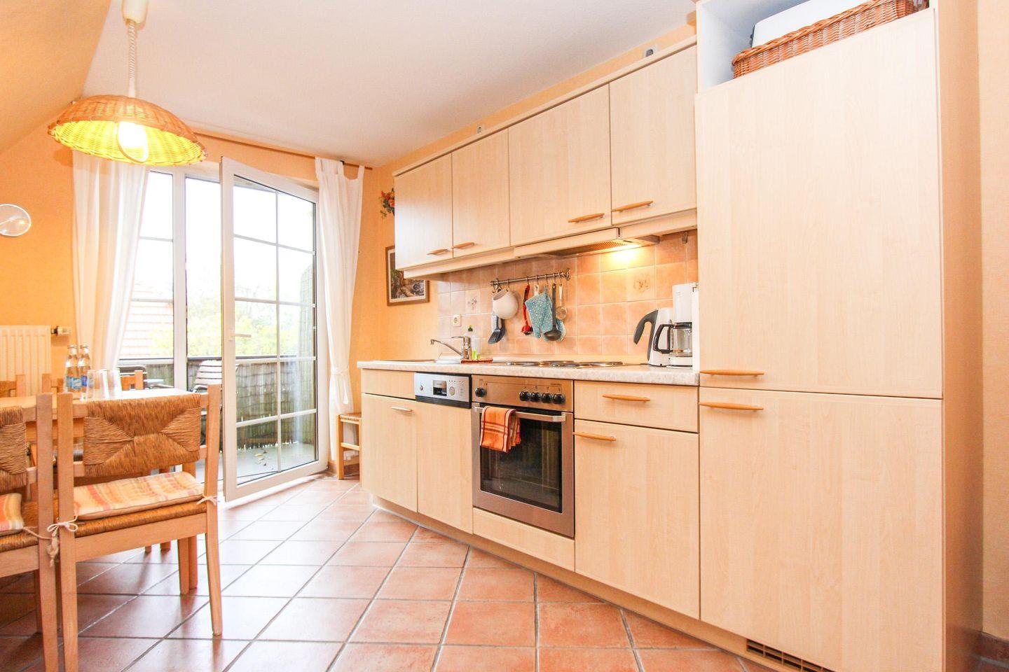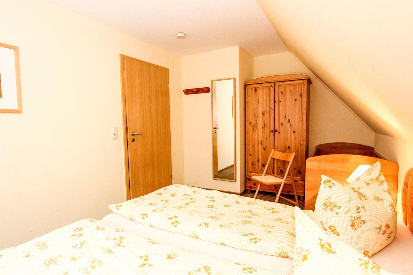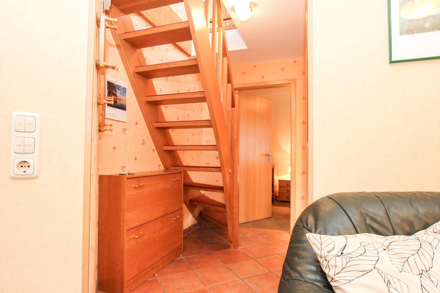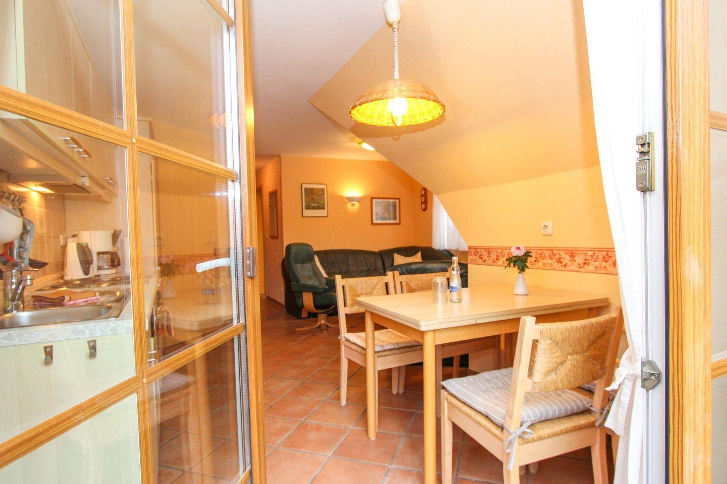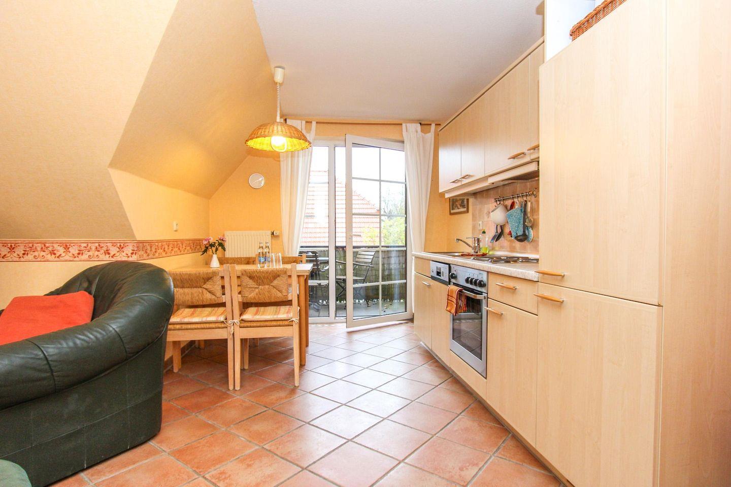 Vom Eingangsbereich der Wohnung im Obergeschoss treten Sie in das helle und großzügige Wohnzimmer mit offener und voll ausgestatteter Küche. Von hier aus gelangen Sie auf den nach Osten ausgerichteten Balkon auf dem Sie entspannt in der Morgensonne frühstücken können. Auf dieser Etage befinden sich außerdem ein geräumiges Schlafzimmer mit einem Doppelbett und das Tageslicht-Duschbad. Im Dachgeschoss finden Sie ein weiteres helles Schlafzimmer mit zwei Einzelbetten. Zu der Wohnung gehört ein Parkplatz direkt am Haus. Außerdem besteht die Möglichkeit Fahrräder vom Eigentümer kostenfrei zu nutzen. Diese werden in abschließbaren Fahrradräumen auf dem Grundstück untergestellt.