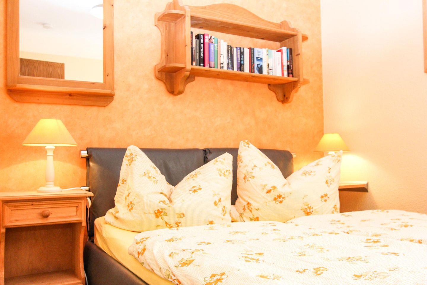 Das Badezimmer mit Dusche und ein geräumiges und ruhiges Schlafzimmer runden diese komfortable Ferienwohnung ab.