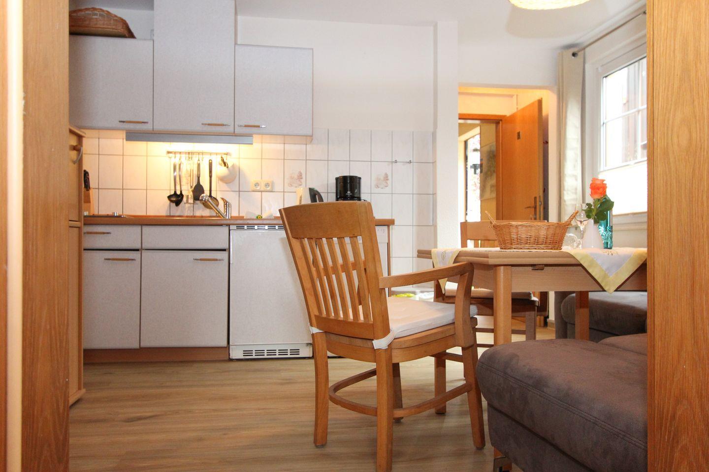 Sie hat einen hellen und gemütlich eingerichteten Wohn- und Essbereich mit offener und gut ausgestatteter Küchenzeile.