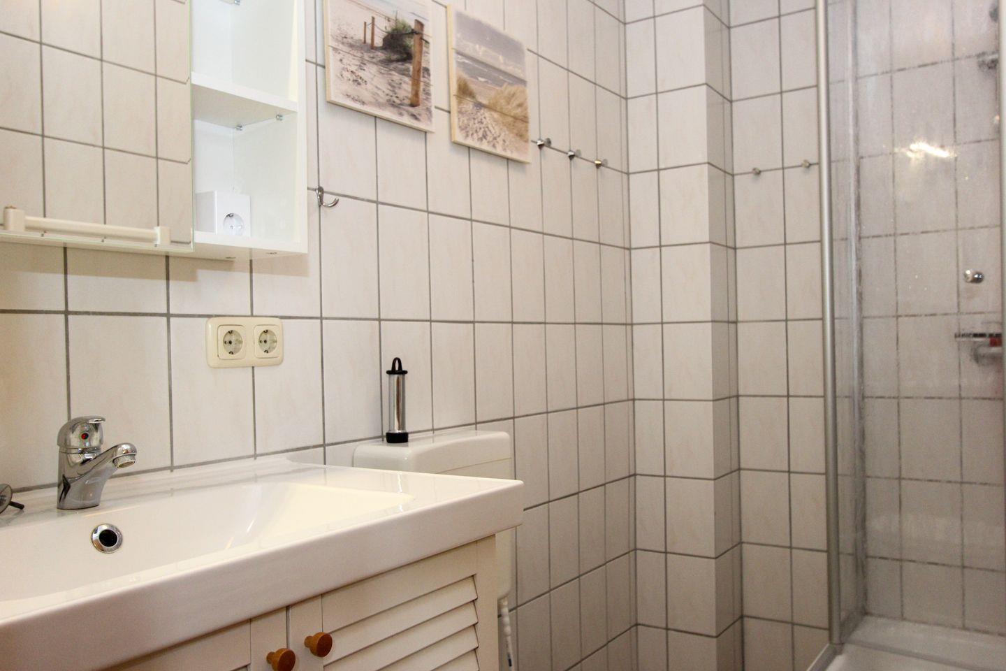 Das Badezimmer mit Dusche und ein geräumiges und ruhiges Schlafzimmer runden diese komfortable Ferienwohnung ab.