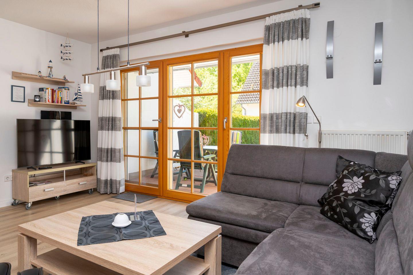 Vom Wohnzimmer gelangen Sie direkt auf die möblierte Terrasse – ein schöner Ort für Mahlzeiten im Freien oder entspannte Stunden in der Nachmittagssonne.