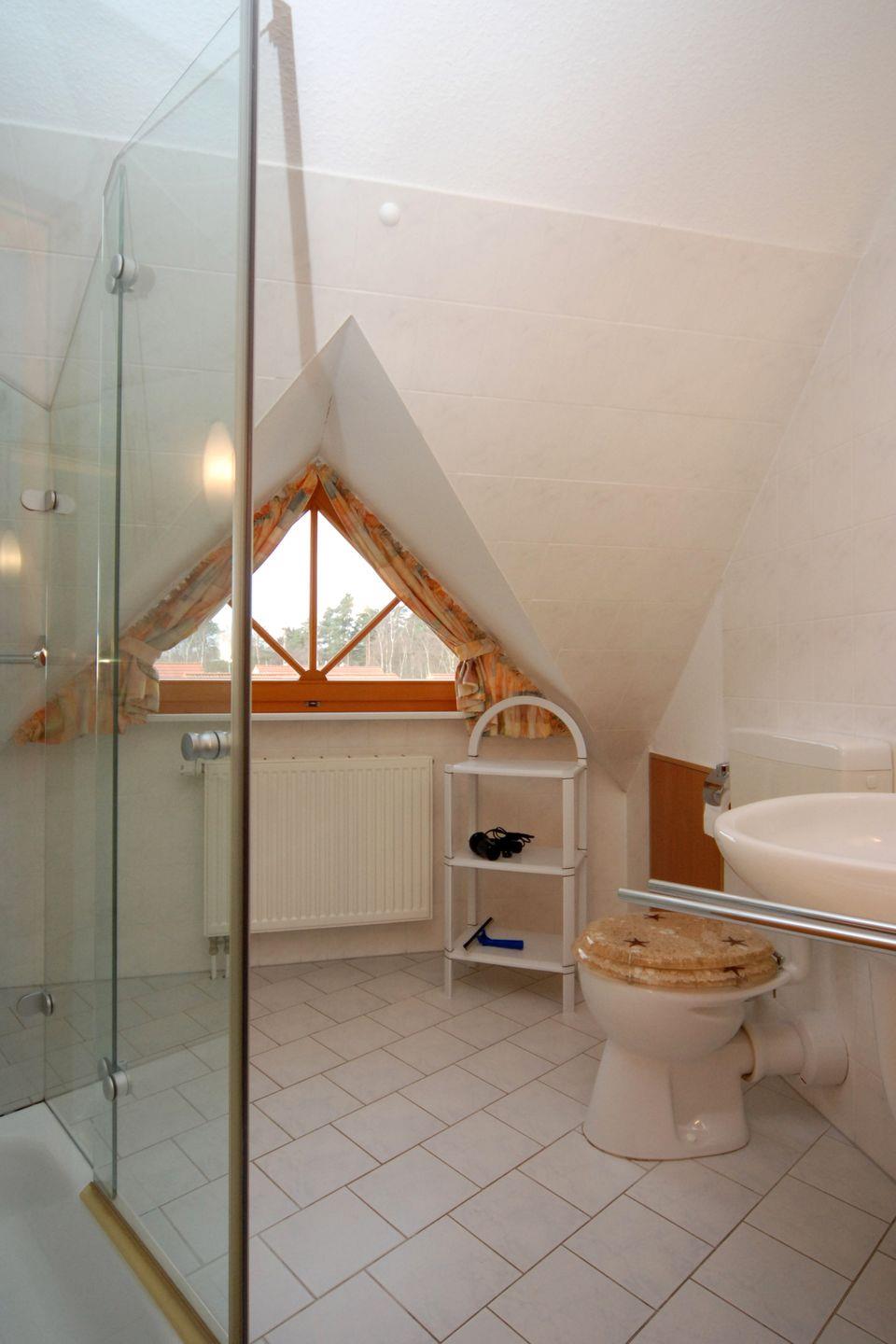 Ein Gäste-WC rundet die erste Ebene ab. Über eine innenliegende Treppe gelangen Sie in die obere Etage mit einem Schlafzimmer inklusive Doppelbett (zwei Matratzen je 90×200?cm) und zusätzlichem TV. Hier befindet sich auch das Badezimmer mit Dusche, WC und Waschbecken. Die Fenster sind mit Fliegengittern ausgestattet – perfekt für ruhige Nächte.