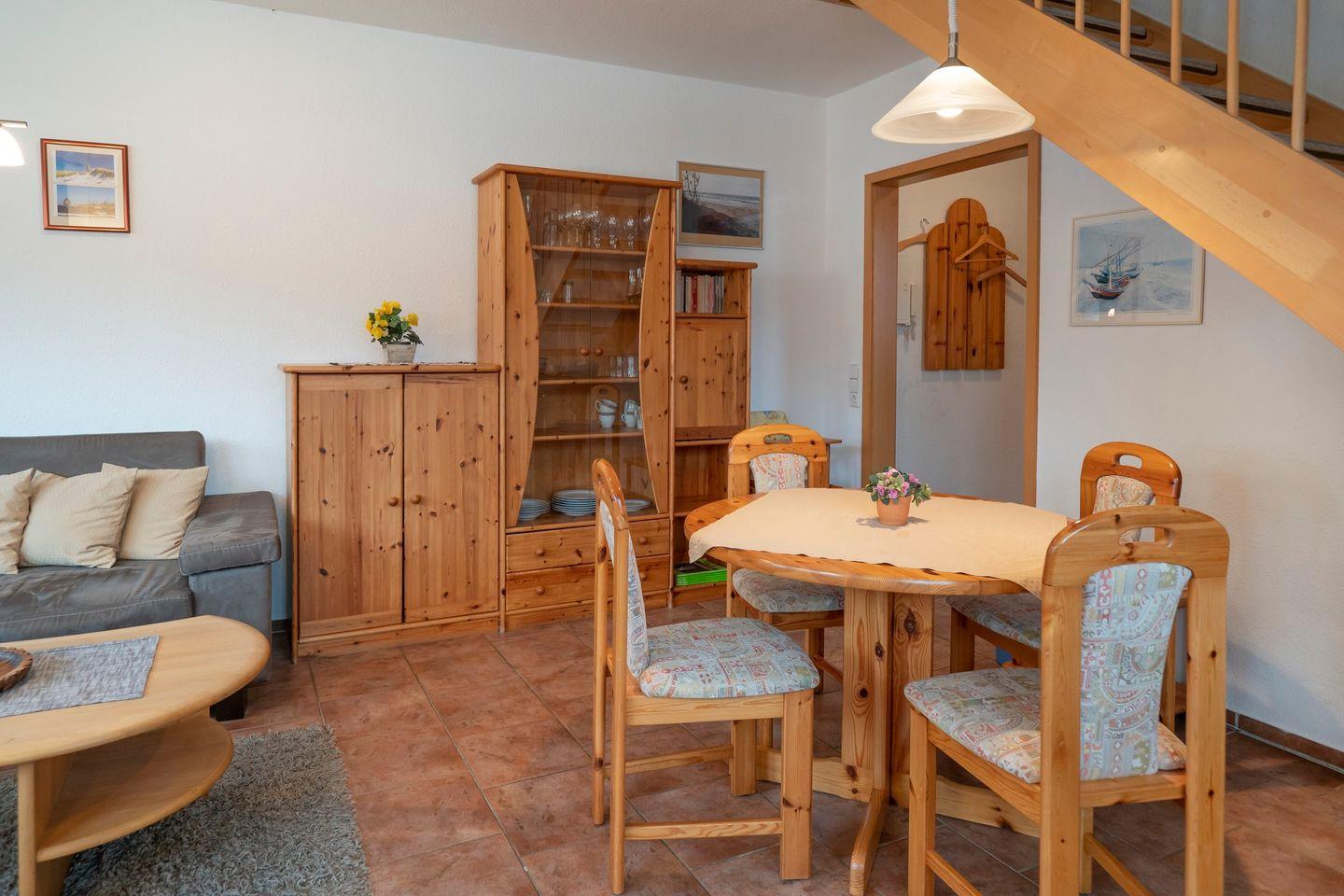 Im unteren Bereich der Wohnung lädt ein gemütlicher Wohnbereich mit Sitzgruppe, TV, Radio und einem Esstisch für vier Personen zum Verweilen ein. Die gut ausgestattete Küche verfügt über einen Backofen, eine Mikrowelle, einen Geschirrspüler, einen Kühlschrank mit Gefrierfach sowie eine Dunstabzugshaube – ideal für Selbstversorger.