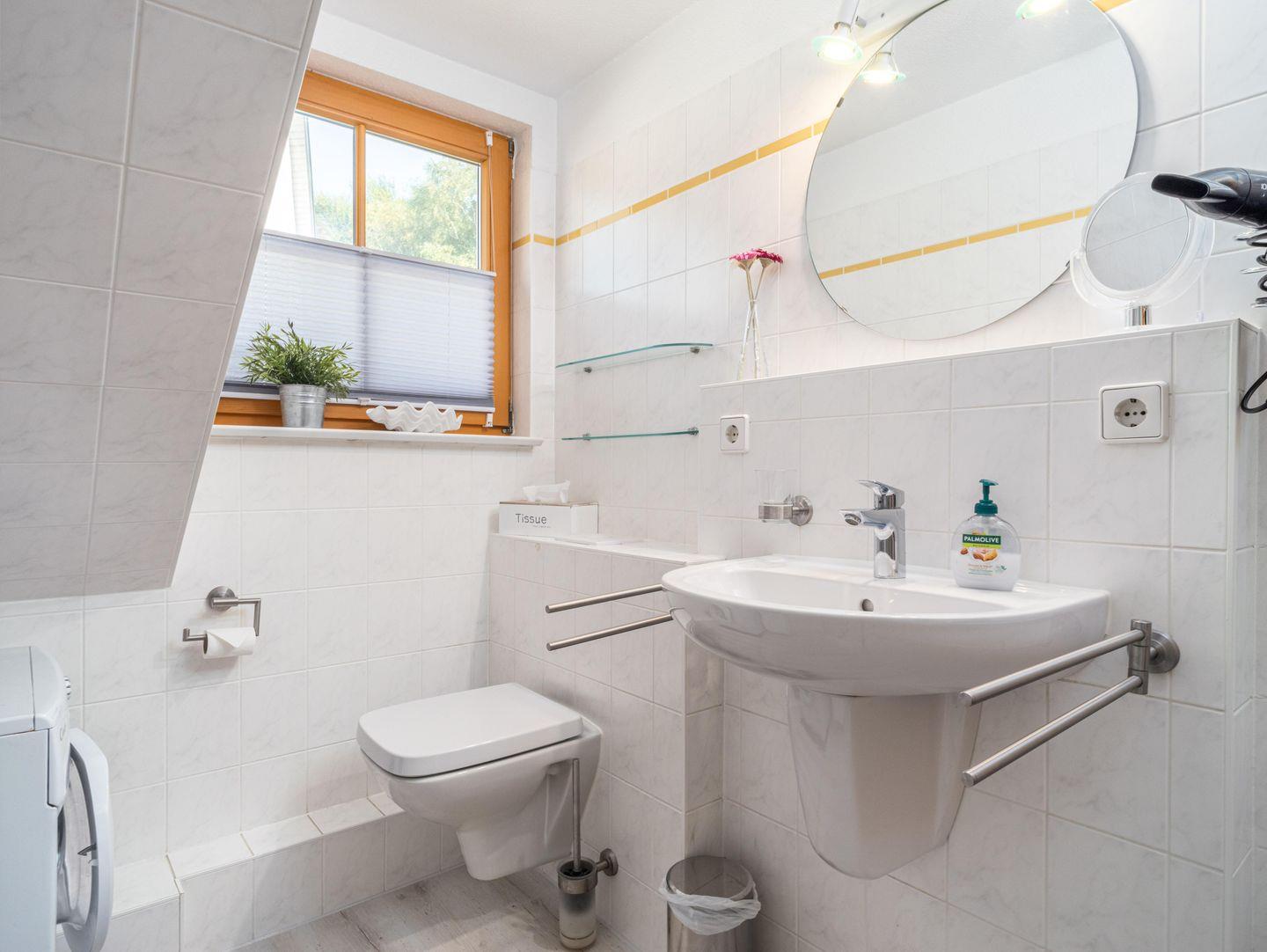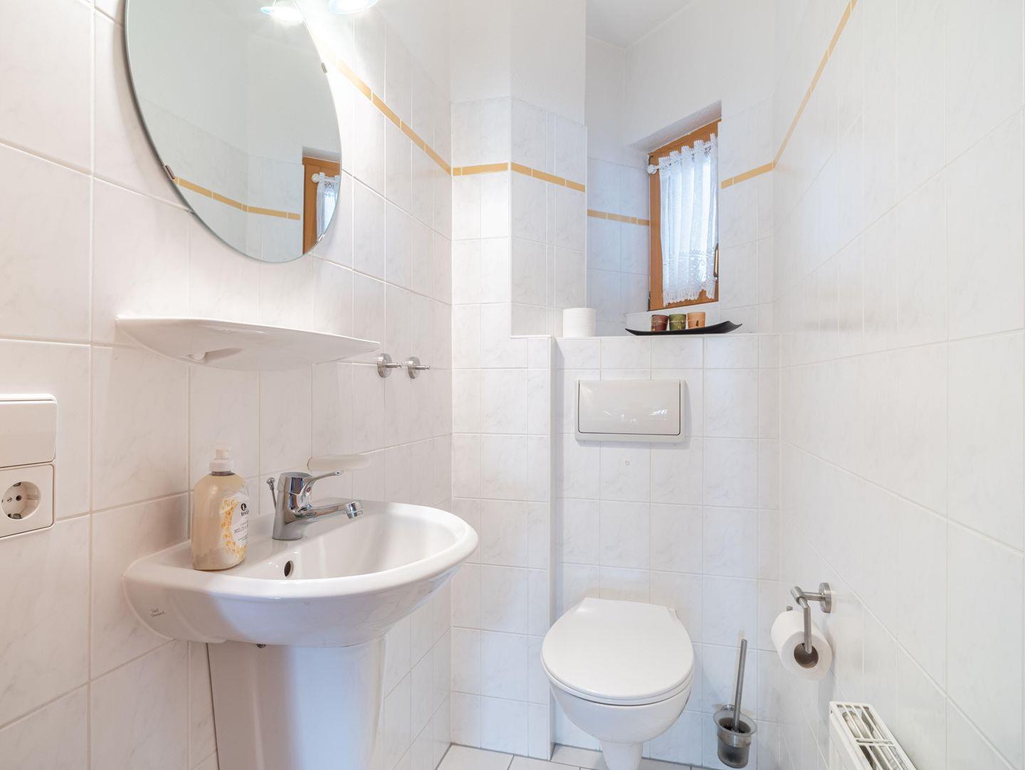 Die moderne Küche ist voll ausgestattet mit Herd, Backofen, Mikrowelle, Kühlschrank mit Gefrierfach, Dunstabzugshaube und Geschirrspüler. Zusätzlich finden Sie im Erdgeschoss ein Gäste-WC sowie einen praktischen Garderobenbereich im Eingangsbereich.