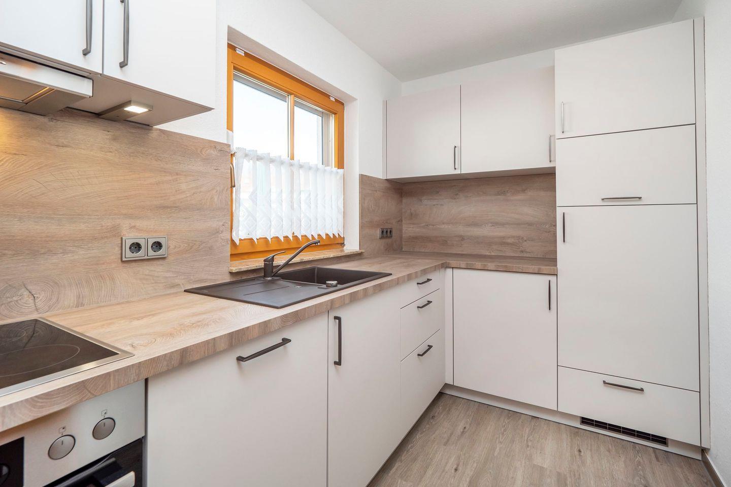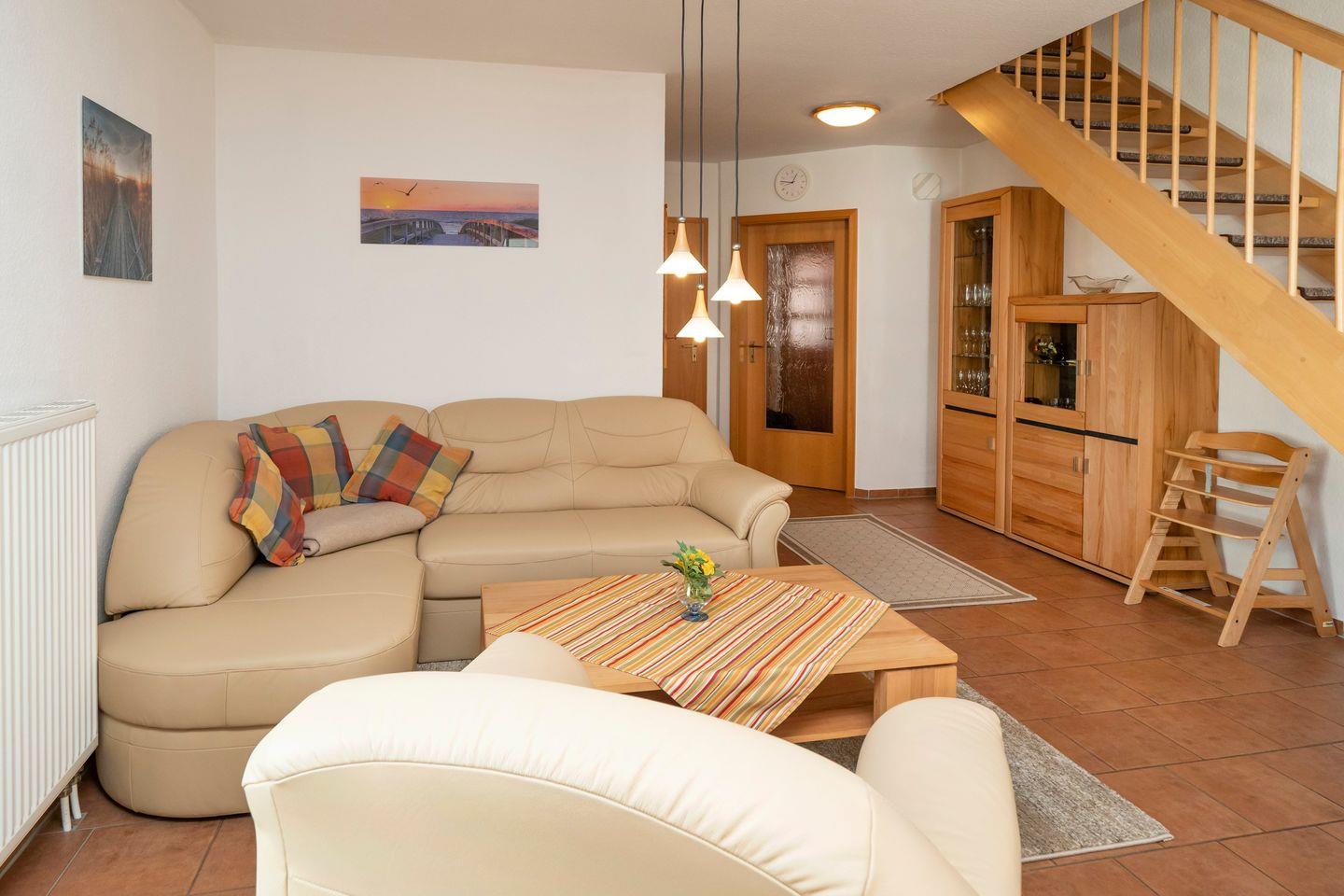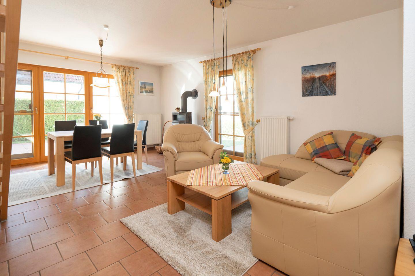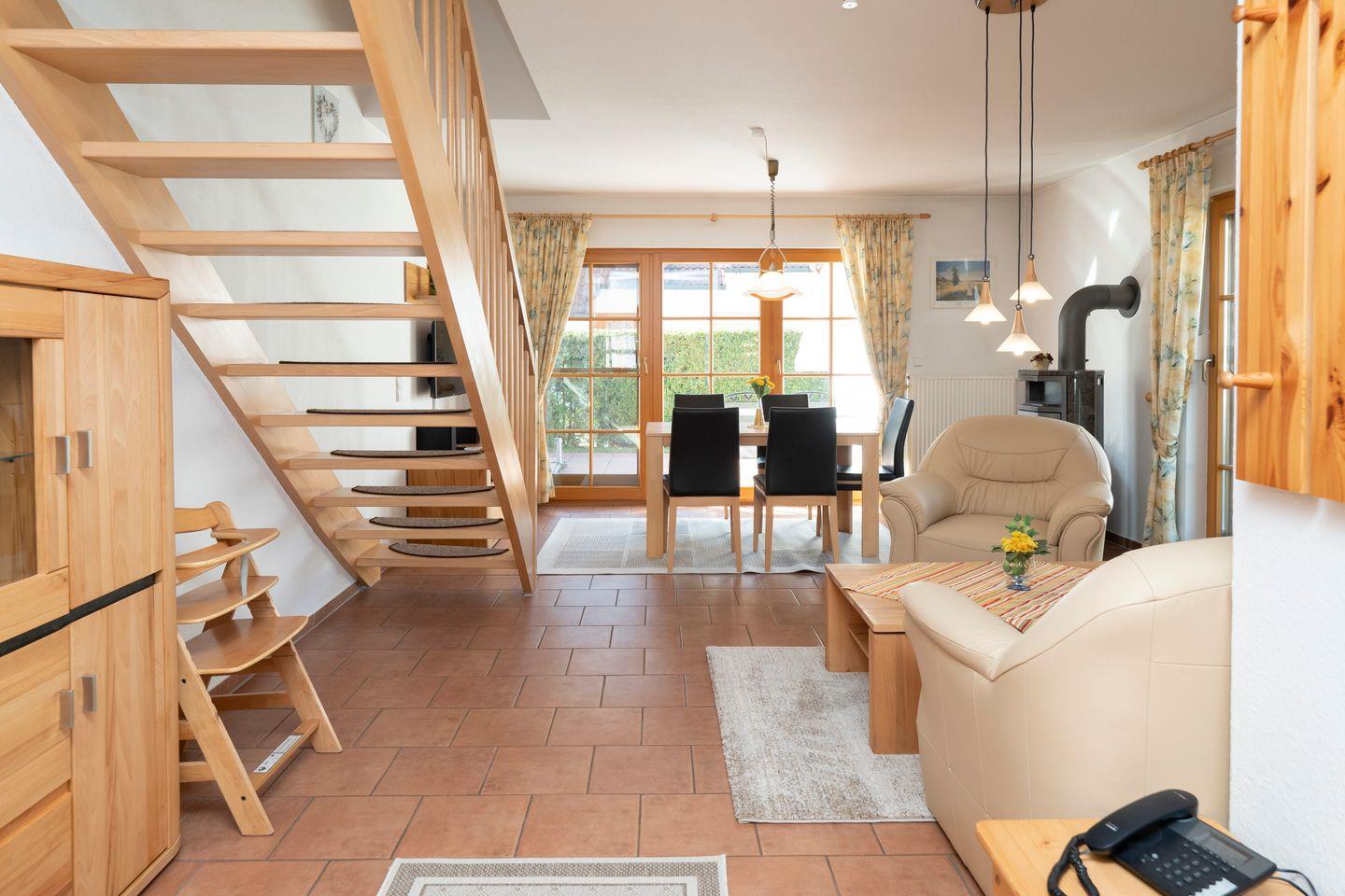 Im Erdgeschoss erwartet Sie ein heller Wohnbereich mit Kaminofen, gemütlicher Sitzgruppe, TV und BlueRay-Player. Der angrenzende Essbereich bietet Platz für vier Personen, die separate Küche ist umfassend ausgestattet – inklusive Geschirrspüler, Backofen und Mikrowelle. Ein Gäste-WC und ein praktischer Garderobenbereich runden das Erdgeschoss ab. Von hier gelangen Sie direkt auf die möblierte Terrasse, die zum Verweilen im Freien einlädt.