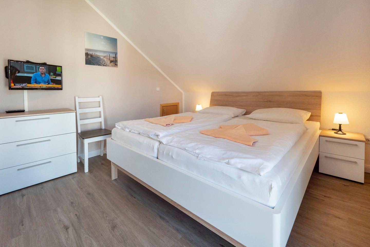 Im Obergeschoss befinden sich zwei Schlafzimmer – eines mit Doppelbett, das andere mit zwei Einzelbetten – sowie ein Badezimmer mit Badewanne, WC, Waschbecken und Waschmaschine.