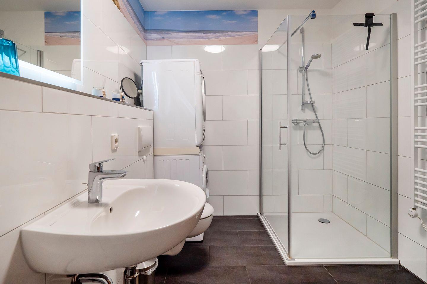 Im Badezimmer befindet sich eine Dusche, Waschbecken, WC und ein Waschtrockner.
