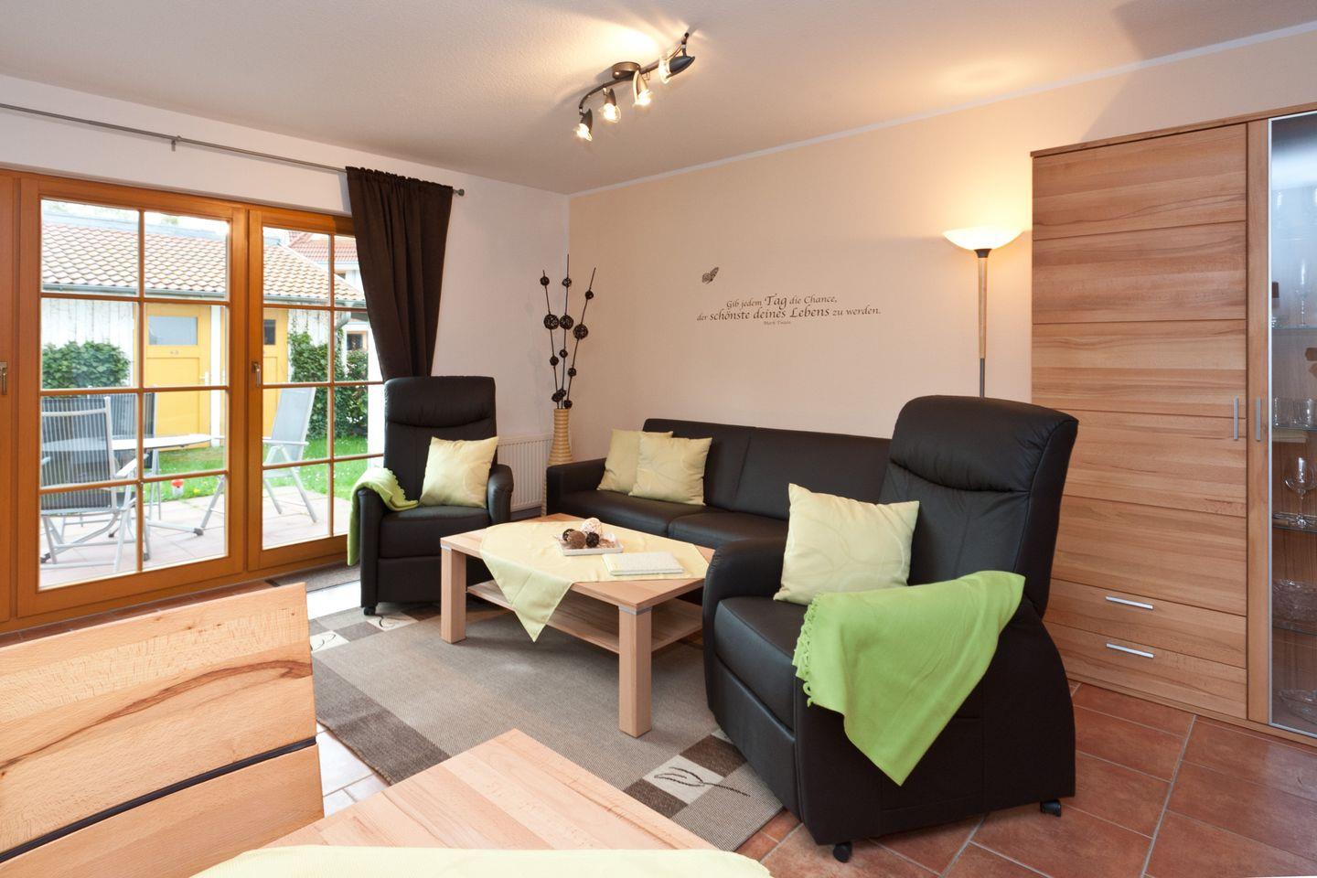 Das Wohnzimmer mit Sitzgruppe TV, DVD Player, sowie Esstisch für 3 Personen lädt zum verweilen ein.