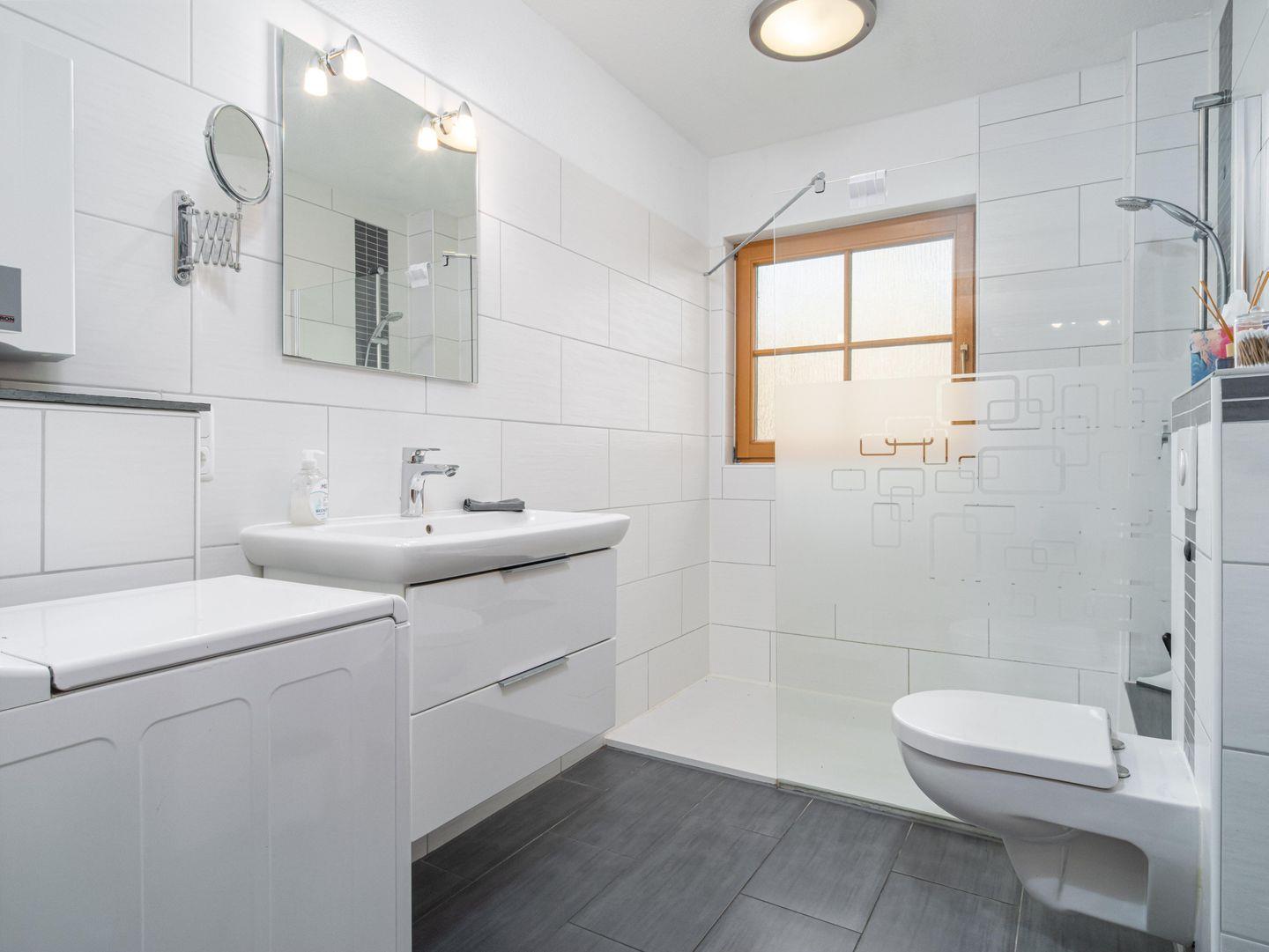 Im Badezimmer befindet sich eine Dusche, WC und Waschmaschine.