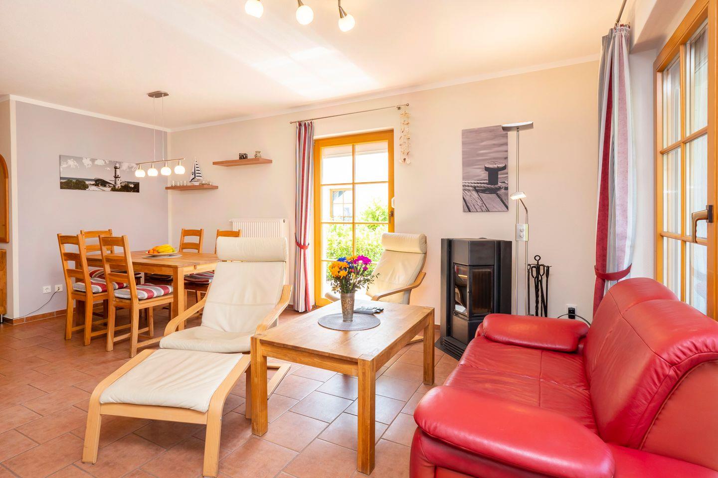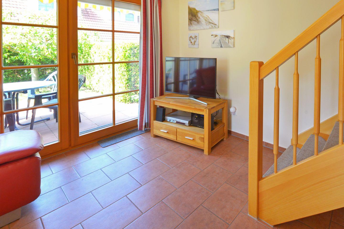 In der ersten Ebene läd der Wohnbereich mit Sitzgruppe, TV, DVD-Player, sowie ein Esstisch für 4 Personen zum Verweilen ein.