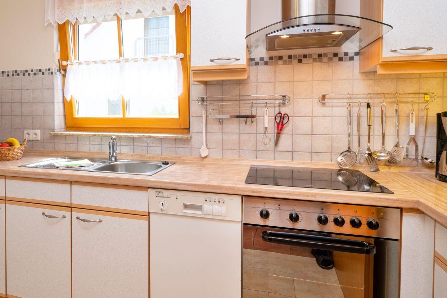 Die Küche ist mit Herd, Backofen, Mikrowelle, Kühlschrank mit Gefrierfach, Dunstabzugshaube und Geschirrspüler ausgestattet.