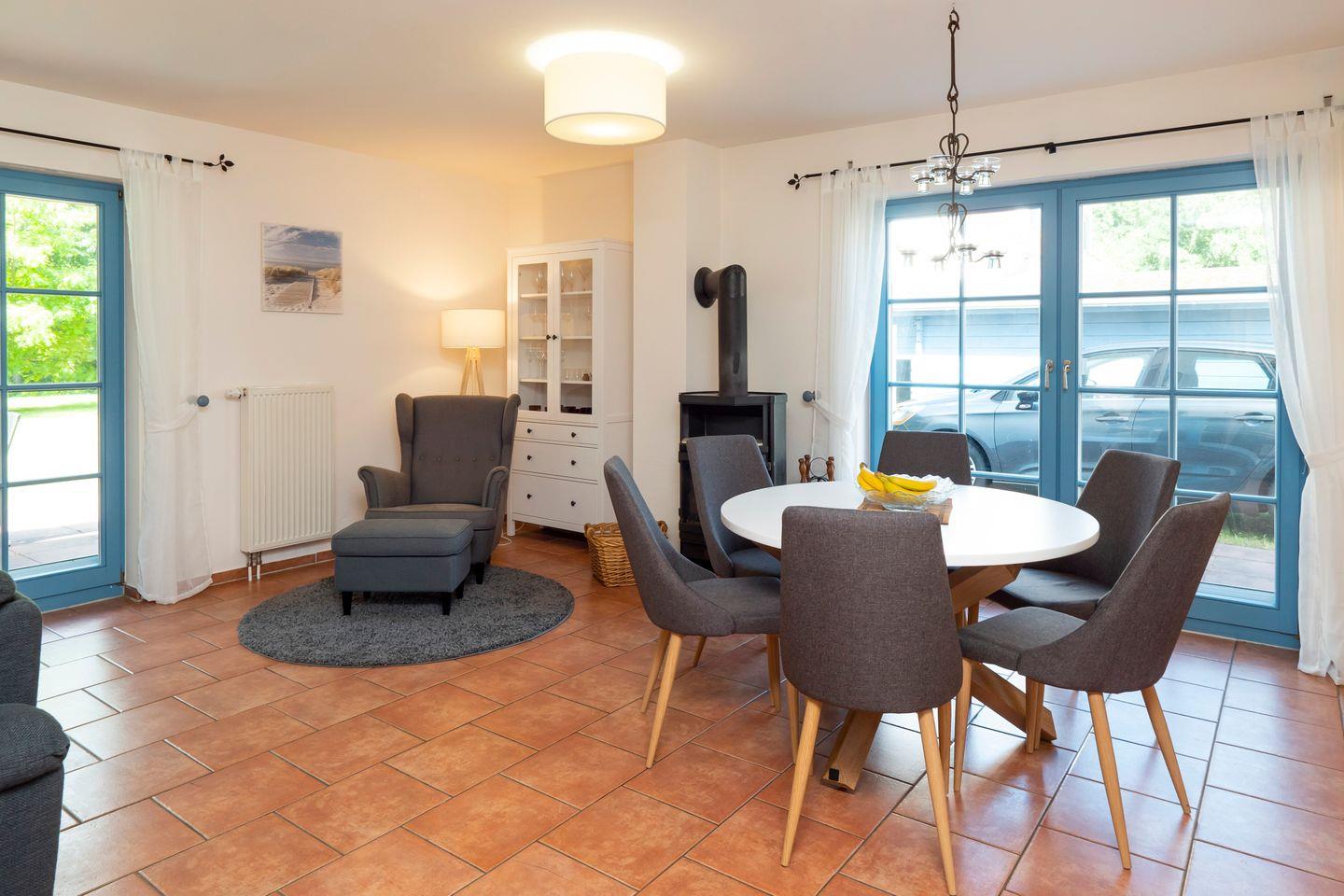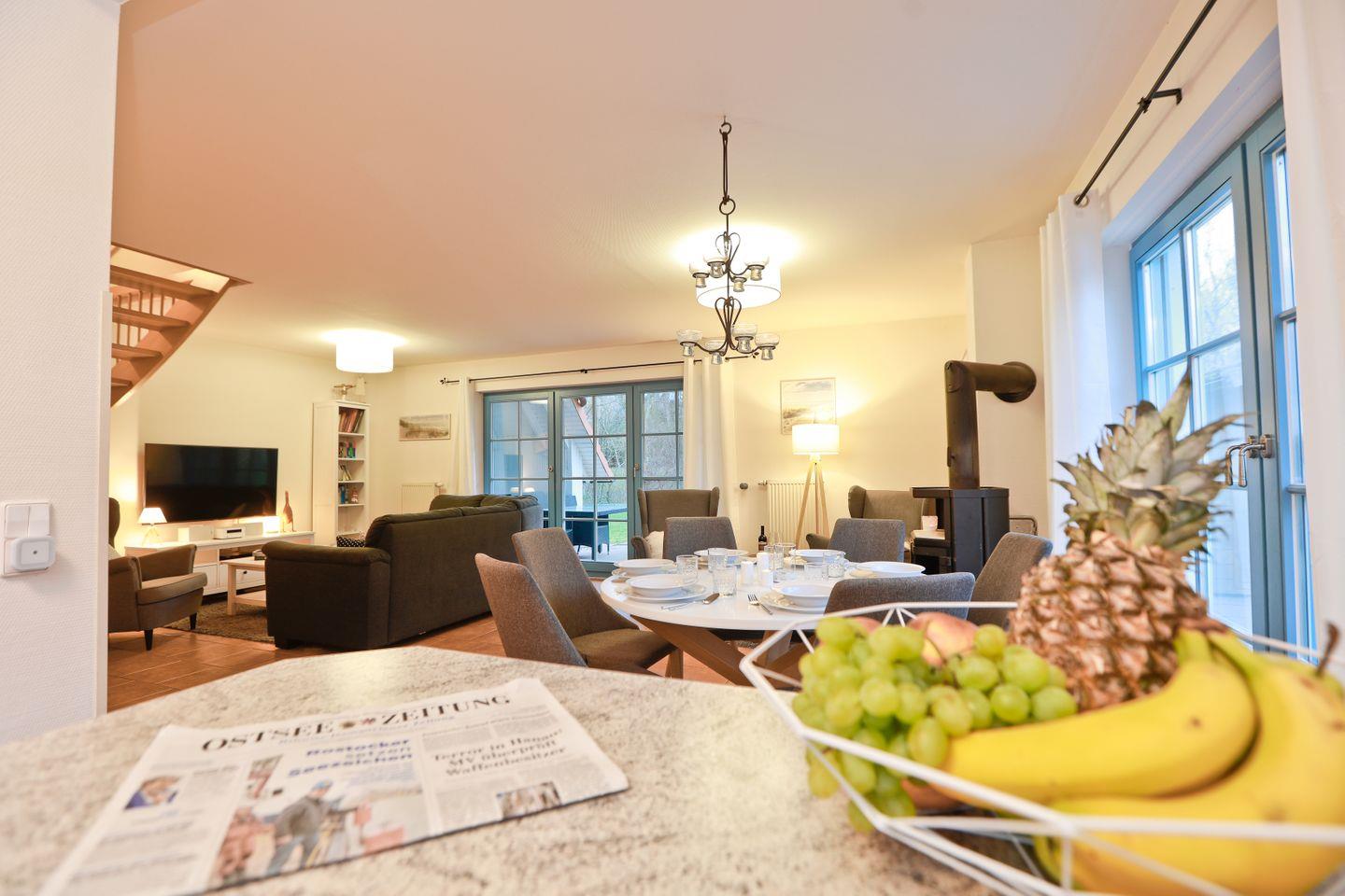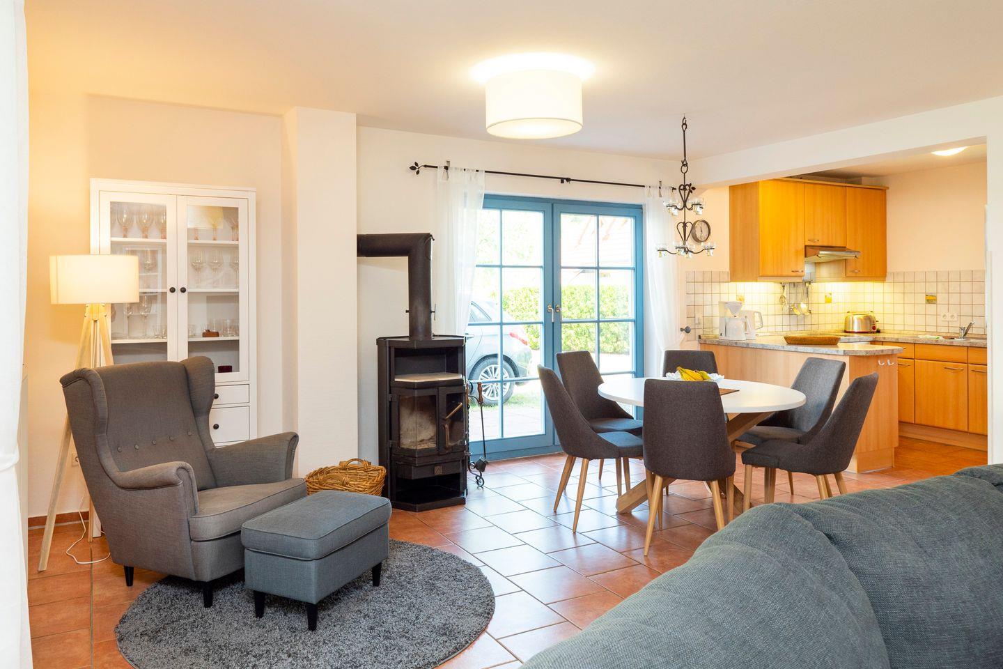 In der ersten Ebene läd der Wohnbereich mit Kamin, Sitzgruppe, TV, Blue-Ray-Spieler, sowie ein Esstisch für 6 Personen zum Verweilen ein.