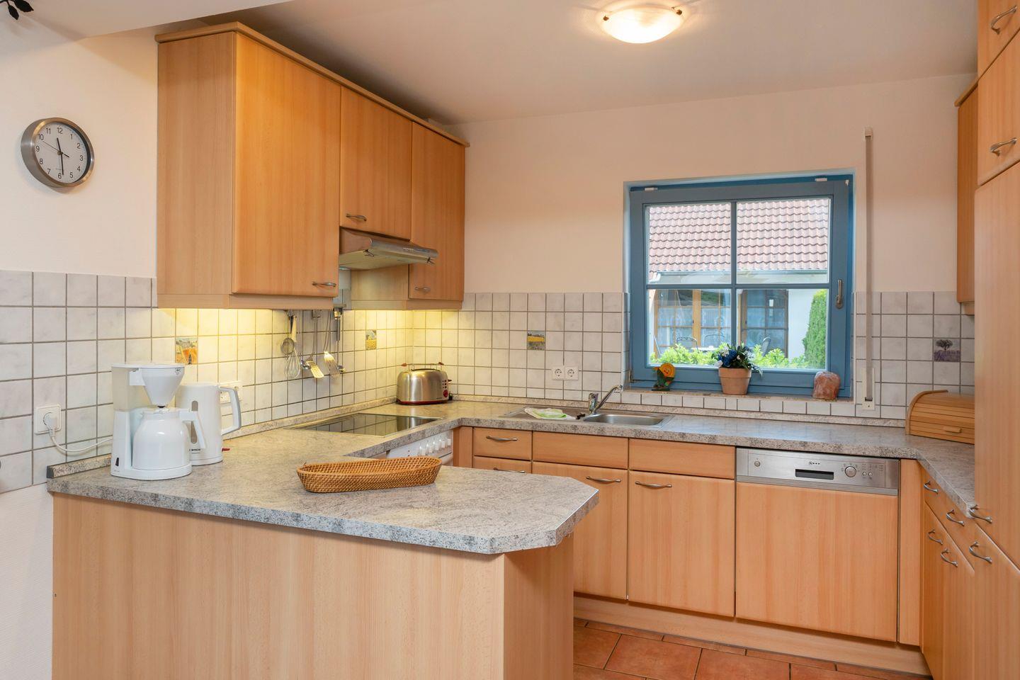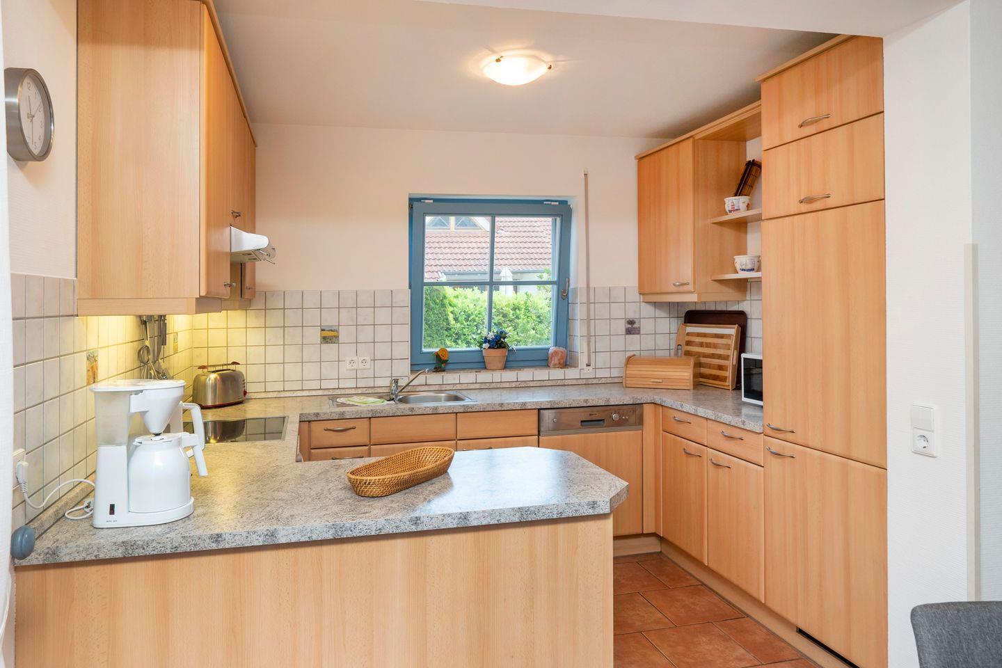 Die Küche ist mit Herd, Backofen, Mikrowelle, Kühlschrank mit Gefrierfach, Dunstabzugshaube und Geschirrspüler ausgestattet.