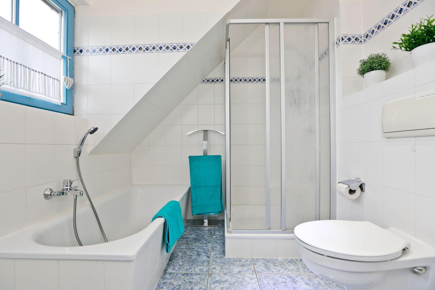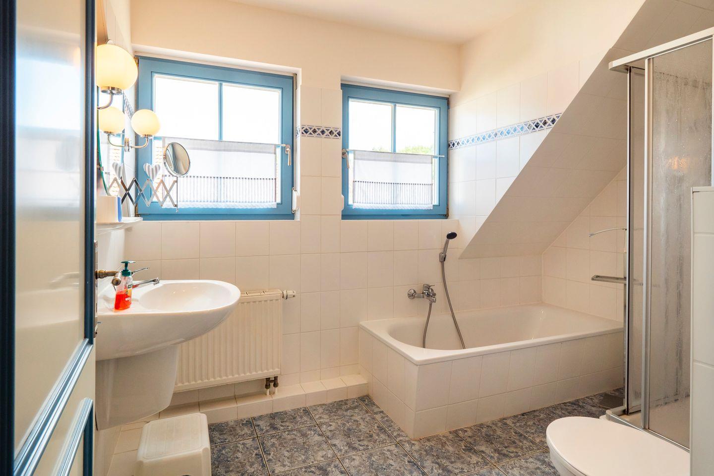 Ein Bad mit Dusche, Waschmaschine und Trockner und ein abgetrennter Eingangs-Garderobenbereich befindet sich ebenfalls im EG.
