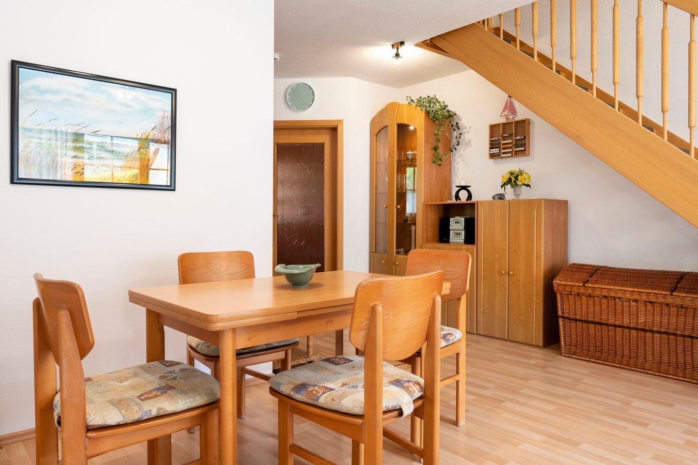 In der ersten Ebene läd der Wohnbereich mit Sitzgruppe, TV, CD-Player, sowie ein Esstisch für 4 Personen zum Verweilen ein.