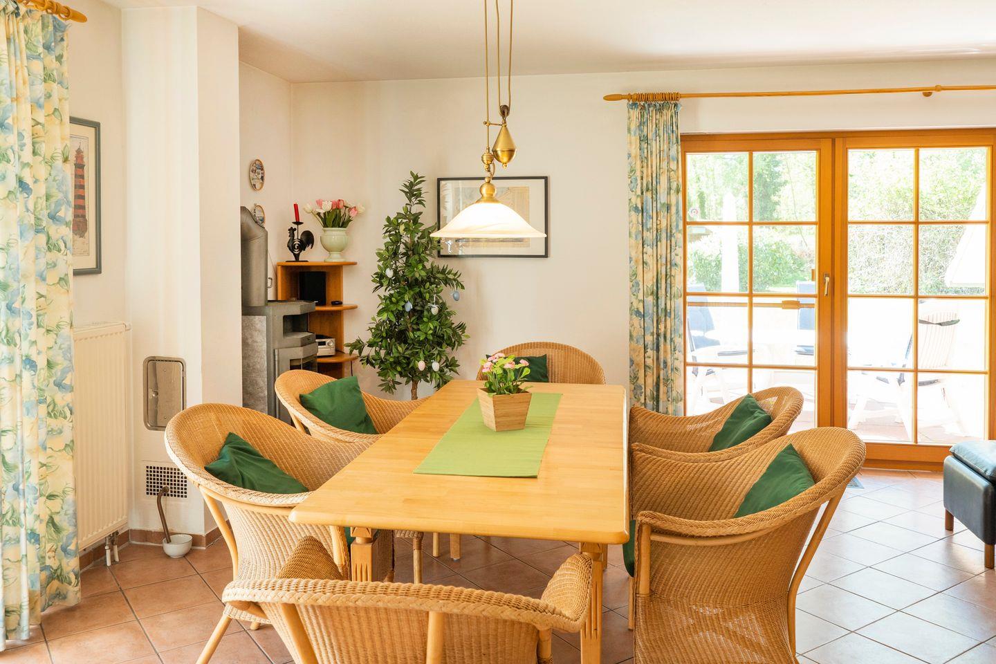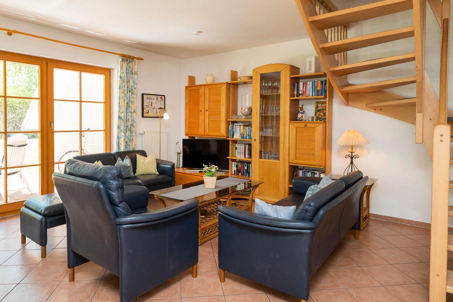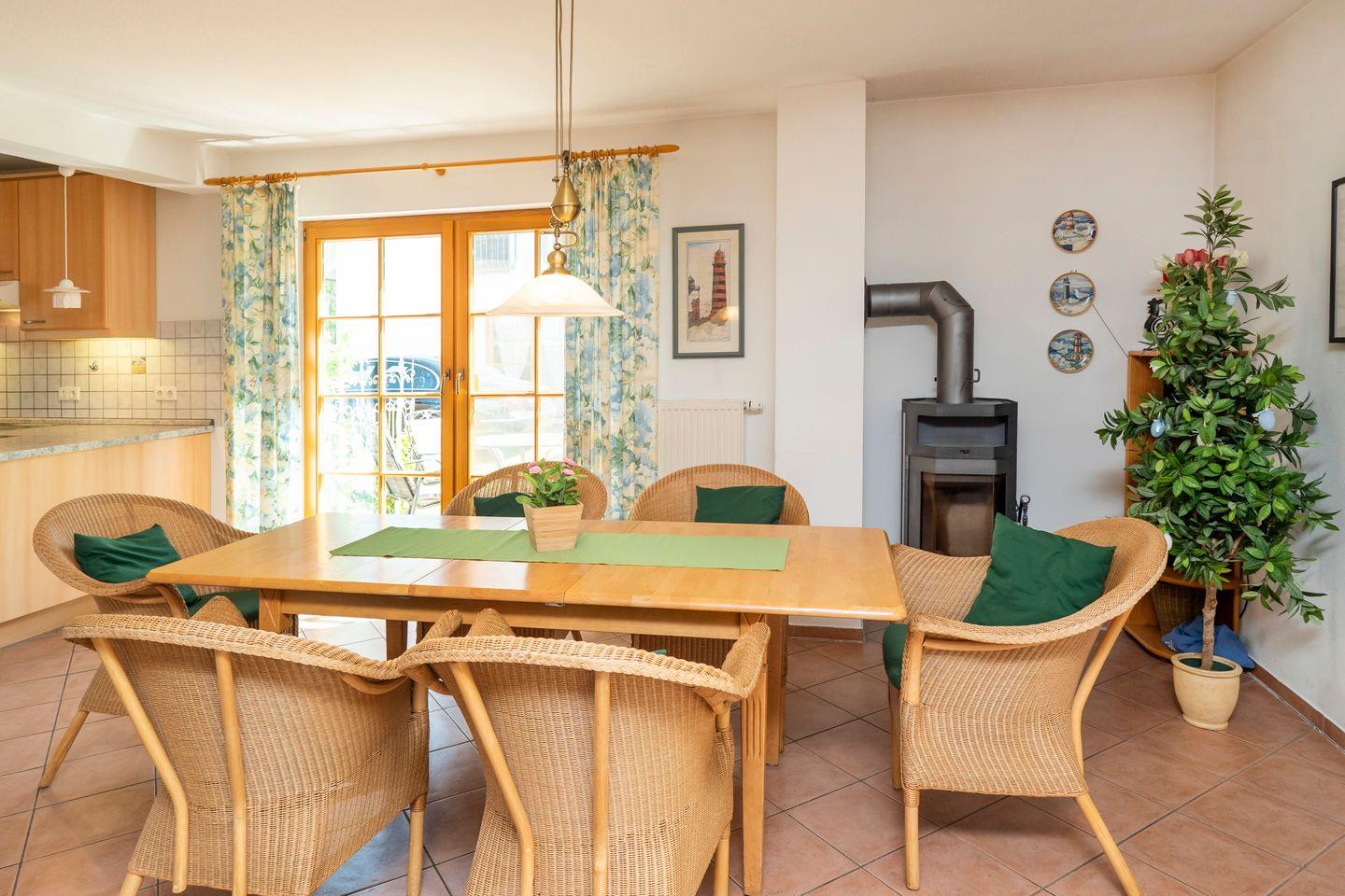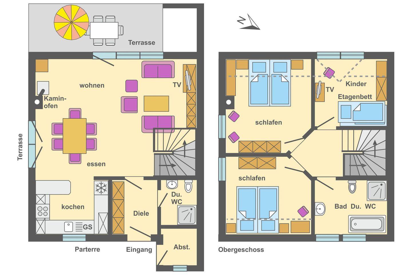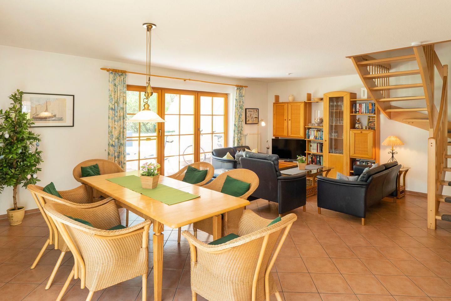 In der ersten Ebene läd der Wohnbereich mit Kamin, Sitzgruppe, TV, CD-Player, sowie ein Esstisch für 6 Personen zum Verweilen ein.