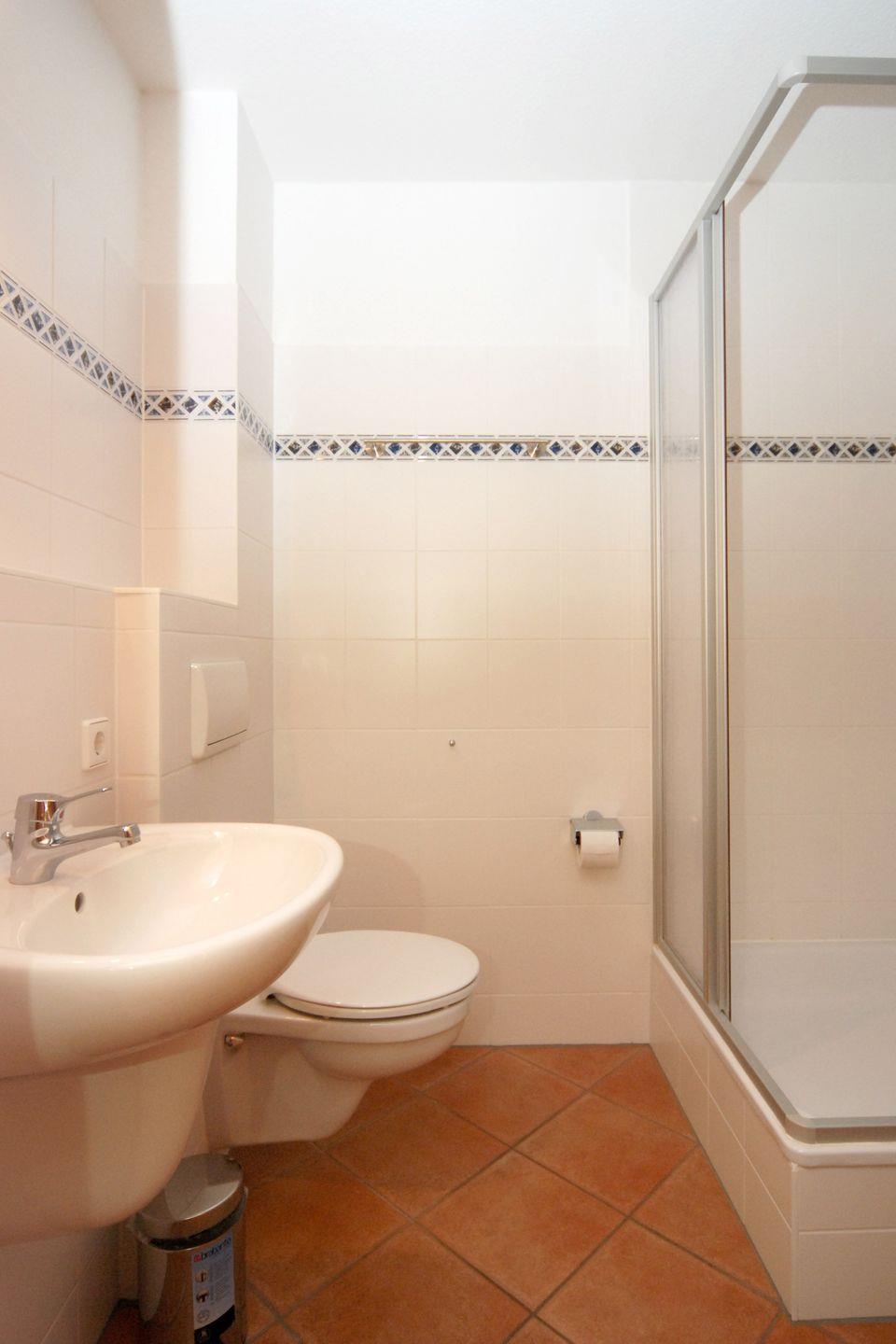 Ein Bad mit Dusche, eine Waschmaschine und ein abgetrennter Eingangs-Garderobenbereich befindet sich ebenfalls im EG.