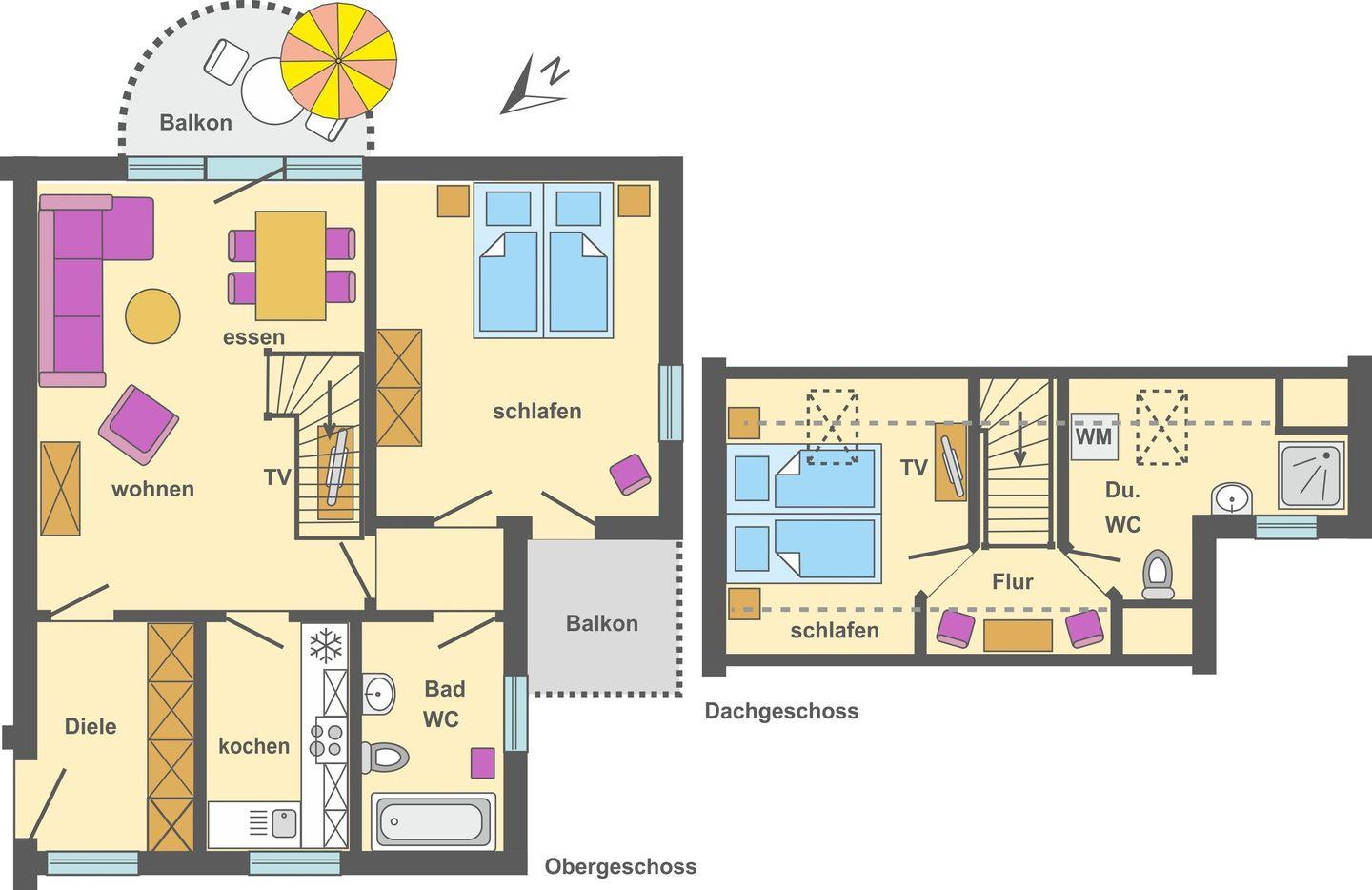In der zweiten Ebene gibt es ein ein Schlafzimmer mit 2 Einzelbetten, ein Bad mit DU, WC und Waschmaschine.