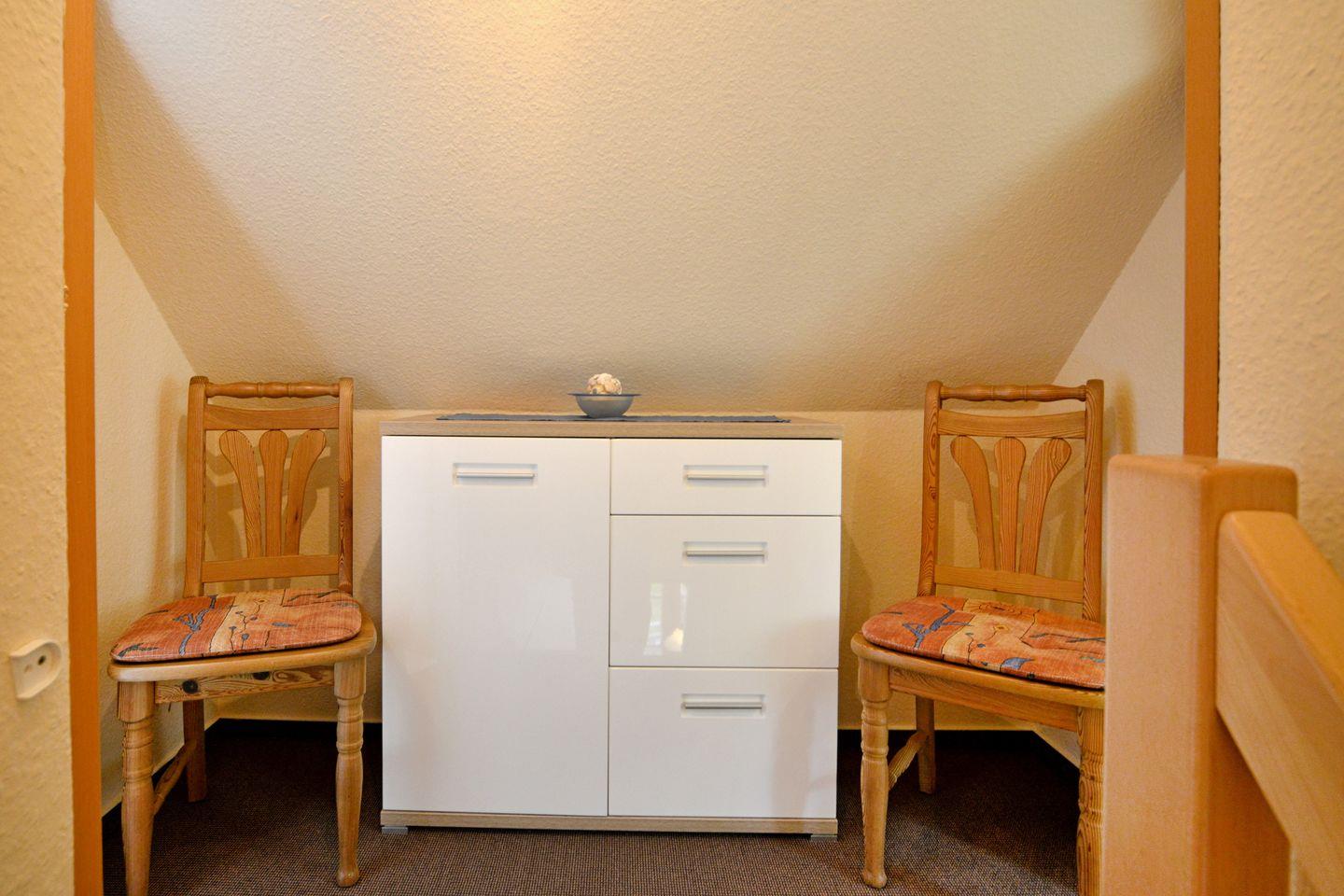 In der ersten Ebene läd das Wohnzimmer mit Sitzgruppe TV, Radio, DVD -Player, sowie ein Esstisch für 4 Personen .zum Verweilen ein.