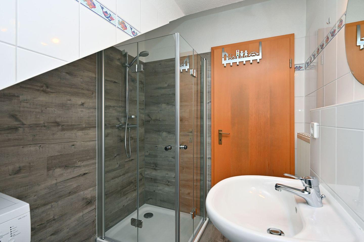 In der zweiten Ebene gibt es 2 Schlafzimmer und ein Badezimmer mit Dusche, Waschbecken, WC und Waschmaschine.