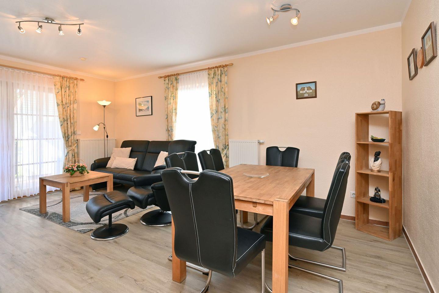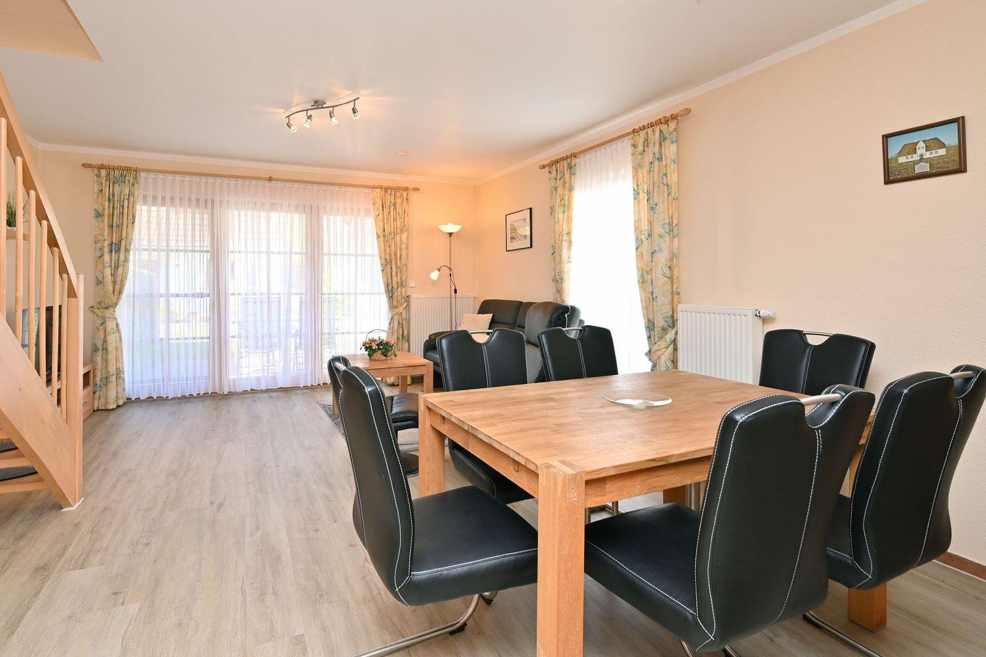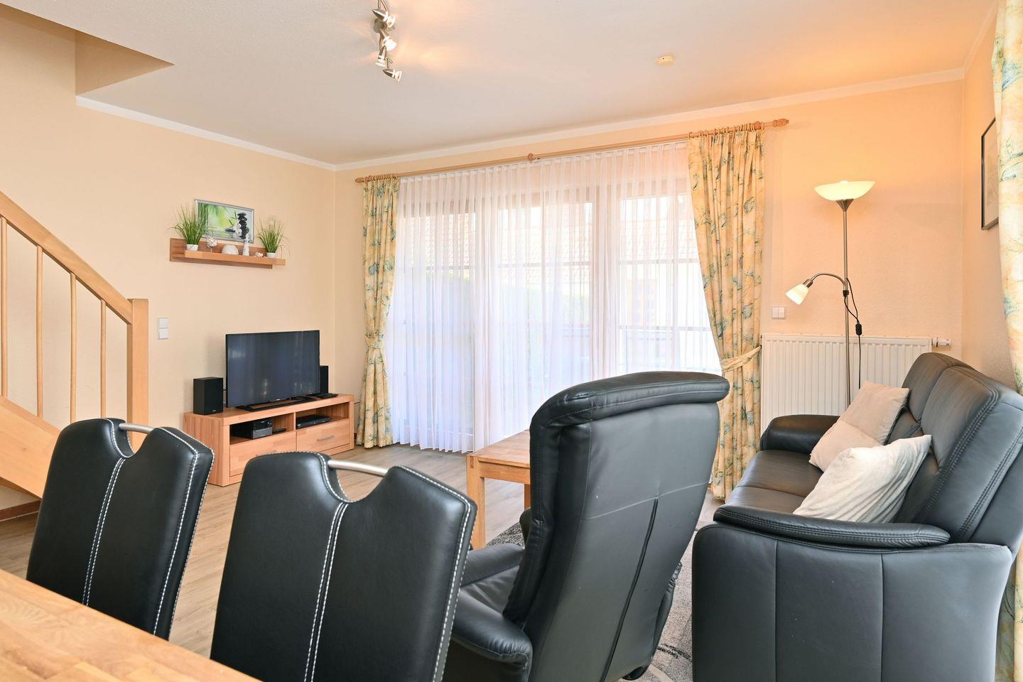 In der ersten Ebene lädt der Wohnbereich mit Sitzgruppe, TV, DVD-Player sowie ein Esstisch für 4 Personen zum Verweilen ein.