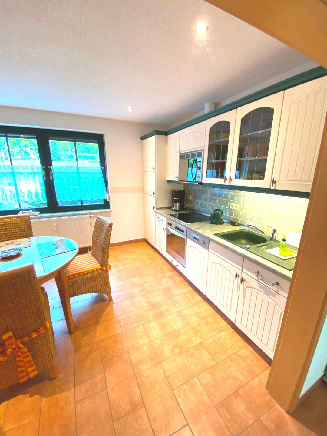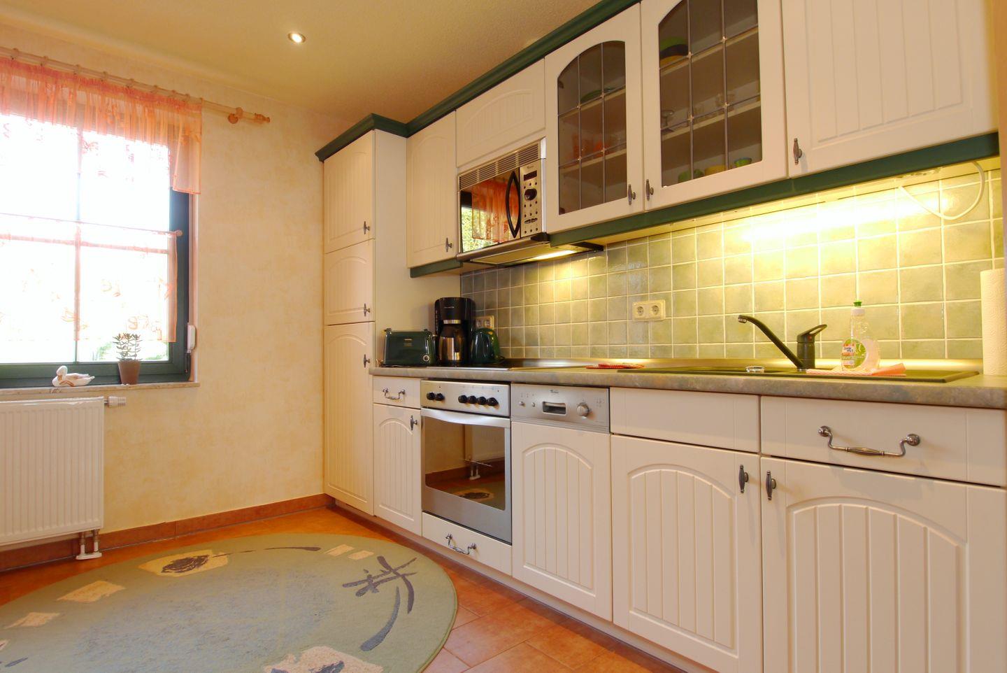 Auf 55 qm bietet diese geräumige Erdgeschosswohnung Platz für bis zu 2 Personen. Über einen Flur mit der Garderobe gelangt man in das Wohnzimmer mit direktem Zugang zur möblierten Südterrasse. Die umfangreich ausgestattete Küche mit der Essecke schließt sich direkt an den Wohnbereich an. Das Schlafzimmer verfügt über ein Doppelbett und einen Kleiderschrank. Im Badezimmer ist ein großer Waschtisch und die Dusche zu finden. Zur Ausstattung gehören zudem ein Gartenhaus für Fahrräder und Außenrollos.